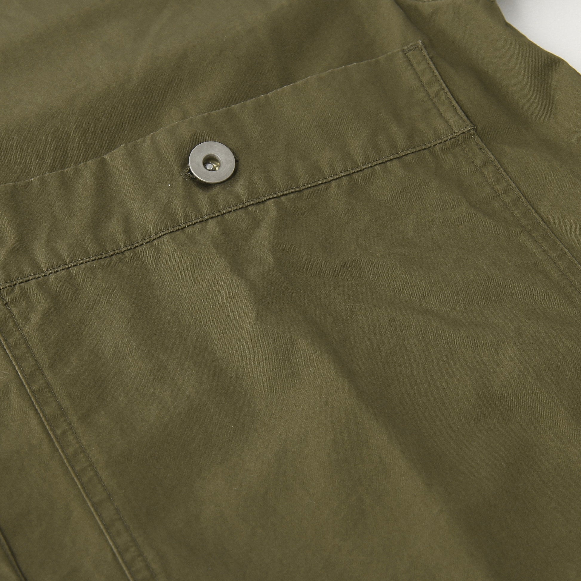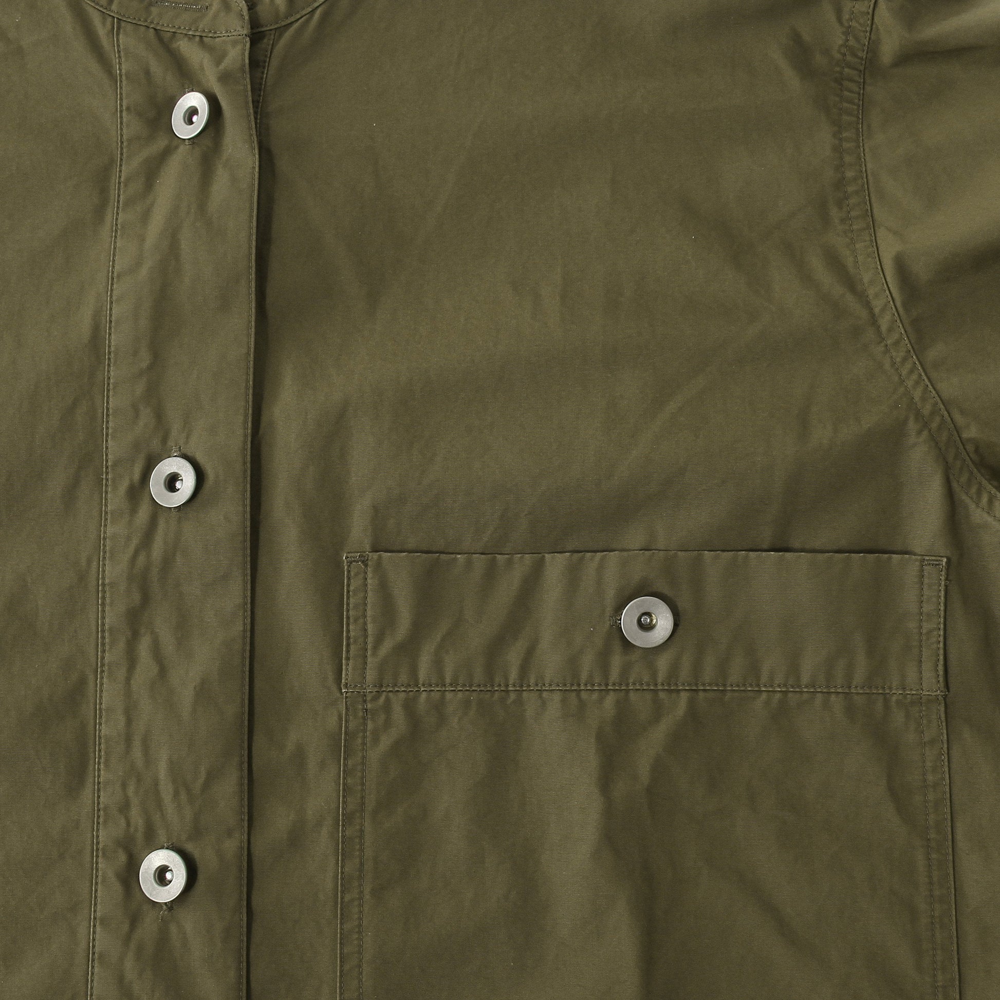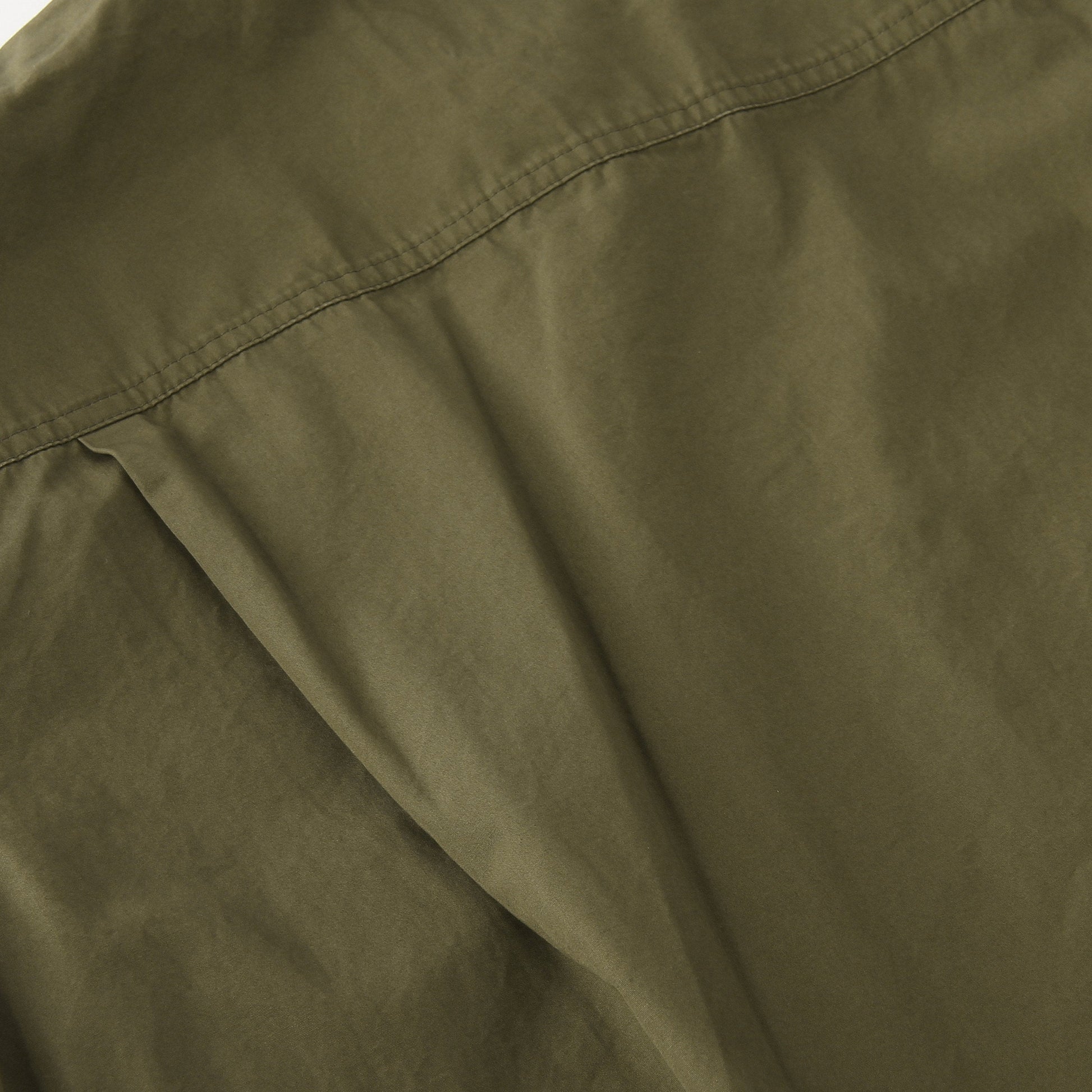 高密度に織り上げた反発性のあるタフな質感と、しっとりとした風合いを併せ持ったコットン素材のドレス。太いスクエアの前立てと、低めに配された大きなパッチポケットが印象的。丸みのあるたっぷりとしたAラインシルエットとWステッチで構成されたディテールのバランスがキャラクターある仕上がり。