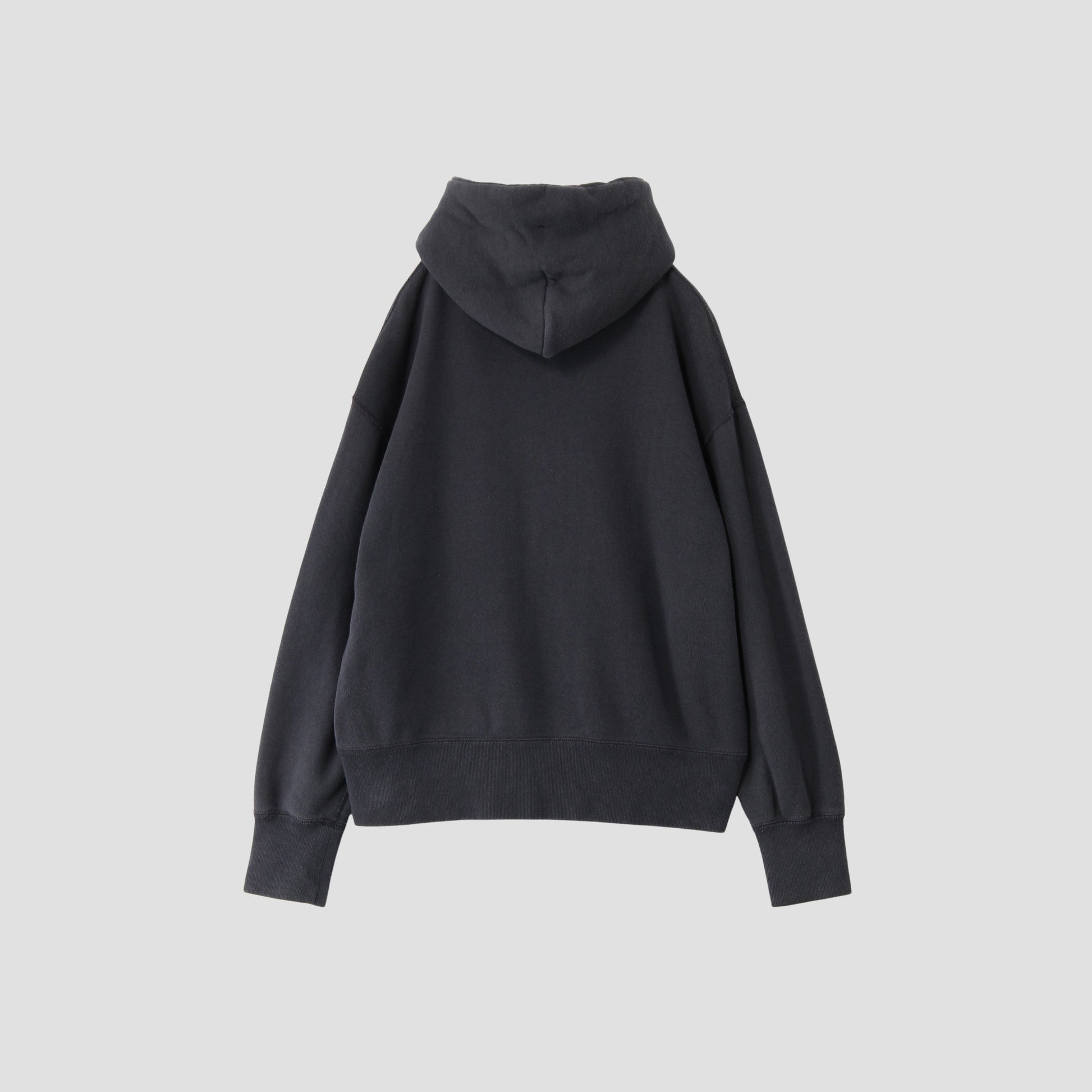 LOOPWHEELERにスペシャルオーダーしたフーデットのジップパーカー。袖口にアイコンディテールでもあるループウィラーのネーム付き。ブラックベースにホワイトロゴはMHLオリジナルカラー。