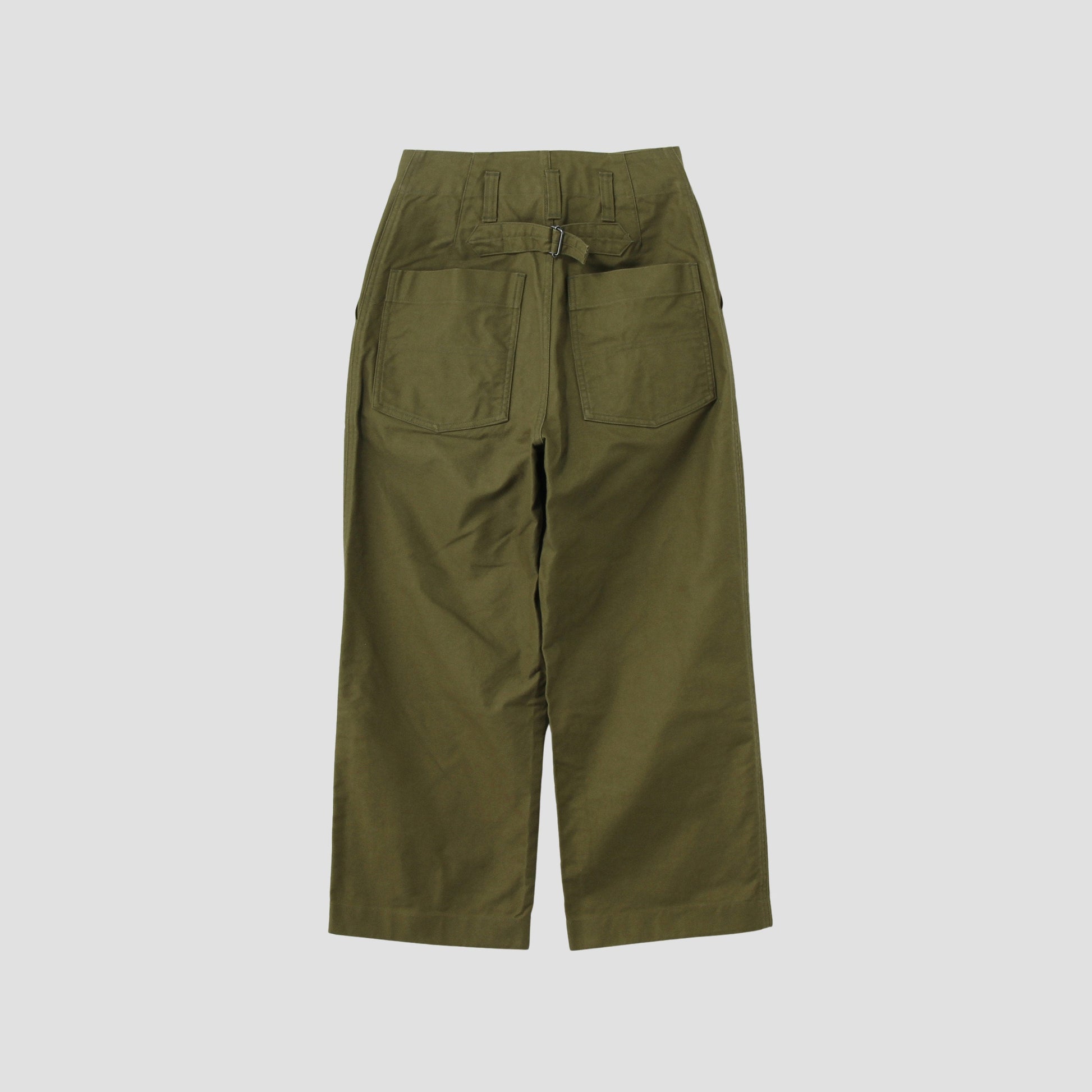 ドライな風合いが特徴のコットン素材を使用したトラウザーズ。経年変化を楽しみながら着用できるタフな素材感が特徴。股上の深いハイウェストの設定で、後ろのシンチバックのデザインがポイント。