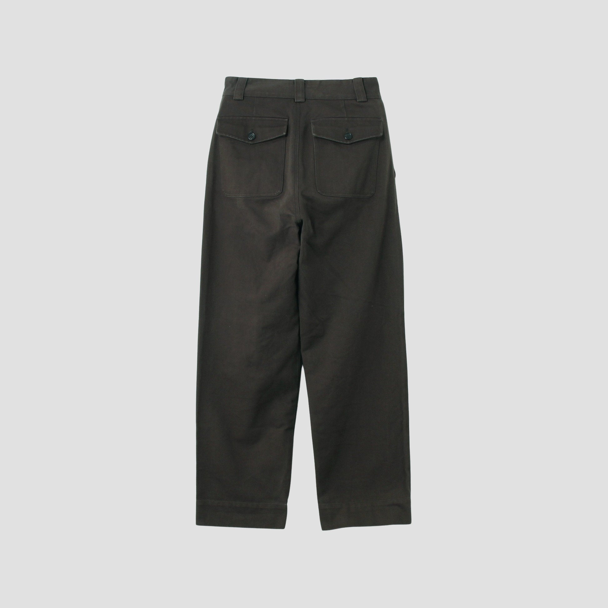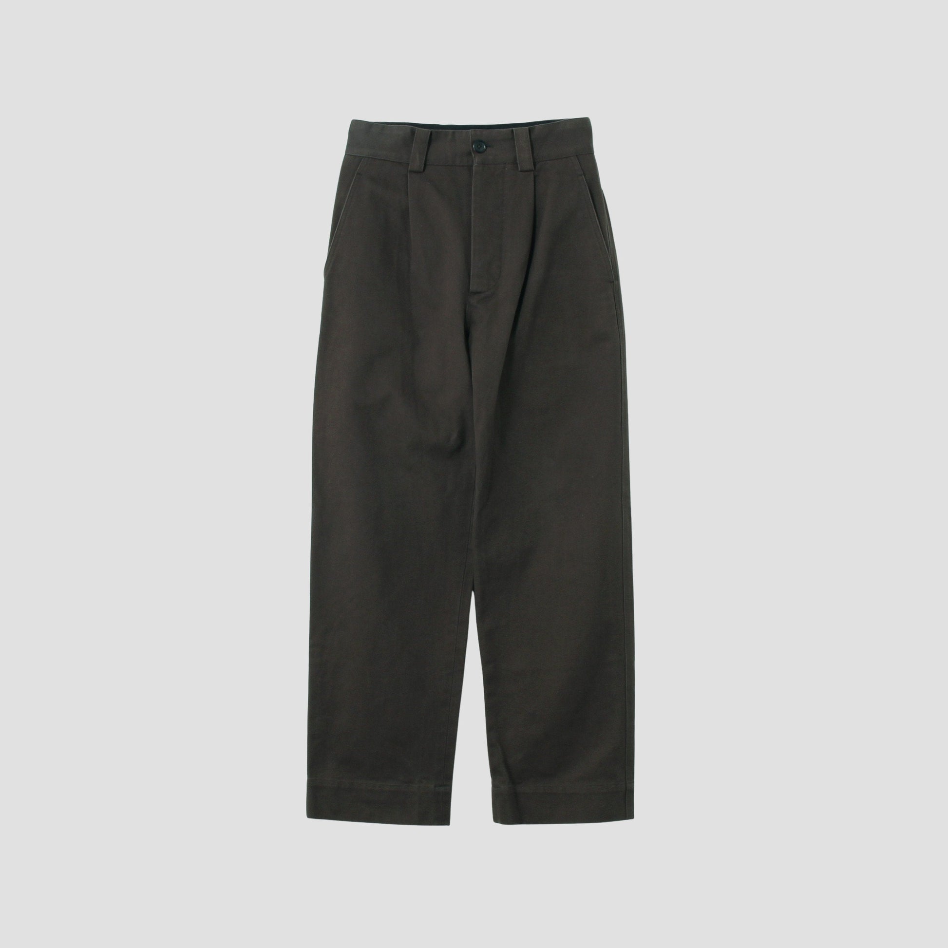 オーガニックコットンを使用したドリル素材のトラウザーズ。高密度に織り上げた素材にバイオ加工を施し、履き込むほどに柔らかく馴染んでいくのが特徴。ヴィンテージチノをベースにしたリラックスフィット。フロントプリーツがあり、深い股上と広い裾口がデイリーに着用しやすいデザイン。