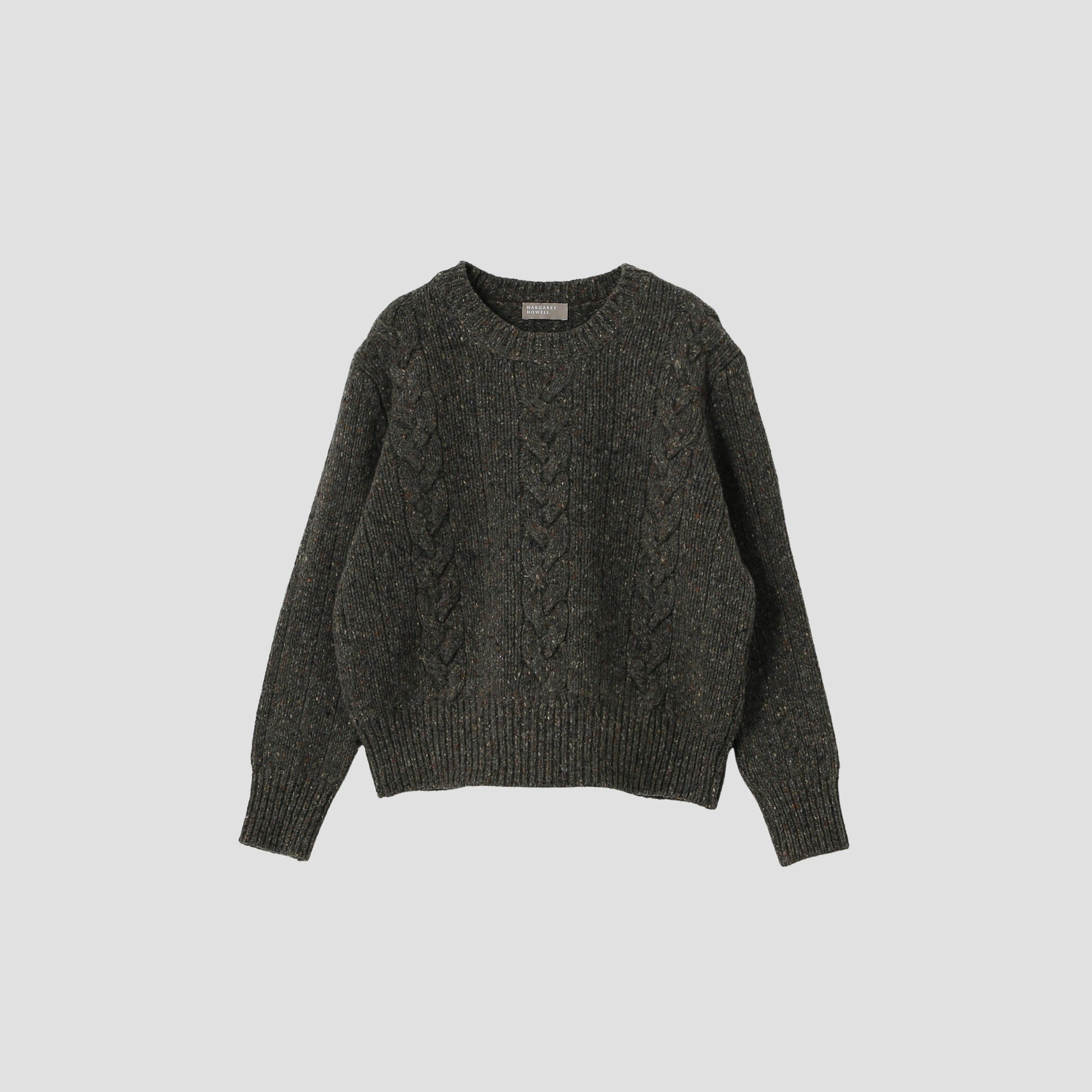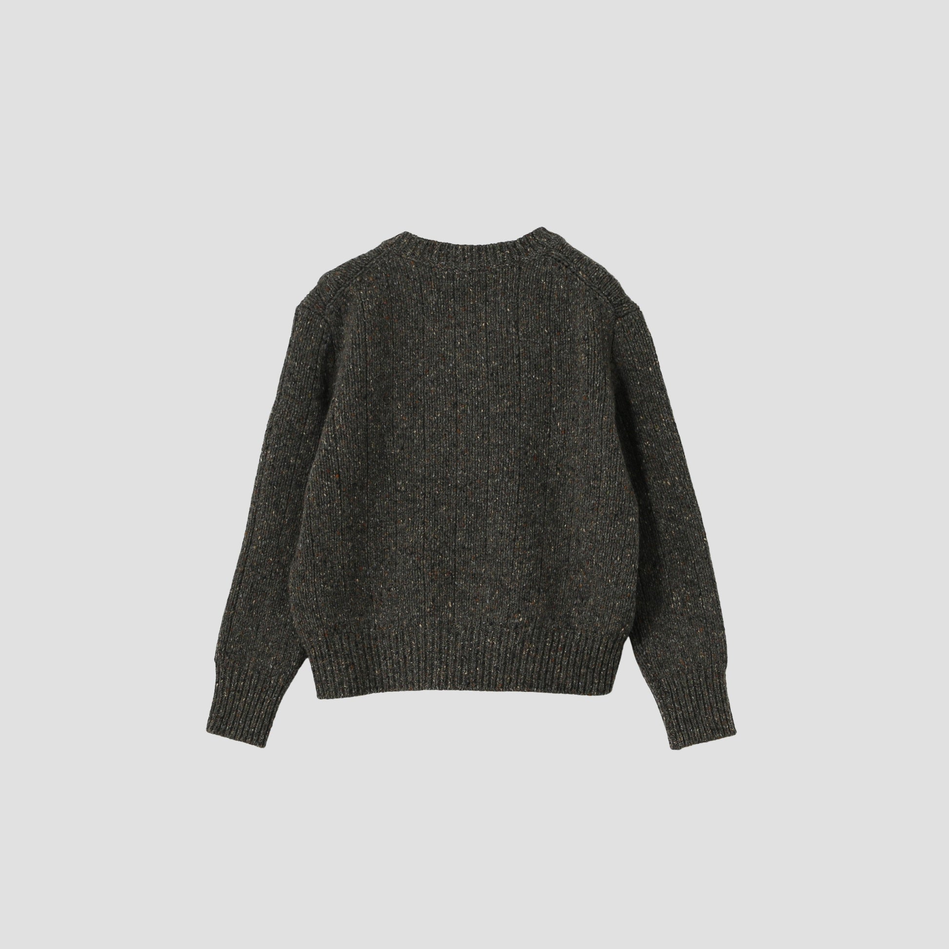 ウール素材を使用したクルーネックのケーブルニット。膨らみやボリューム、カラフルなネップ、不均一な太さが特徴のホームスパン糸を使用したアイテム。