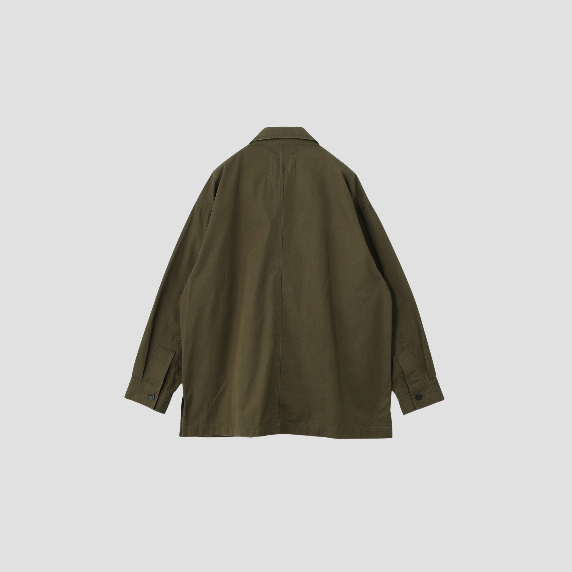 腰に付いた大きなパッチポケット、深めに設計されたサイドベンツ、リラックスしたサイズ感が特徴。