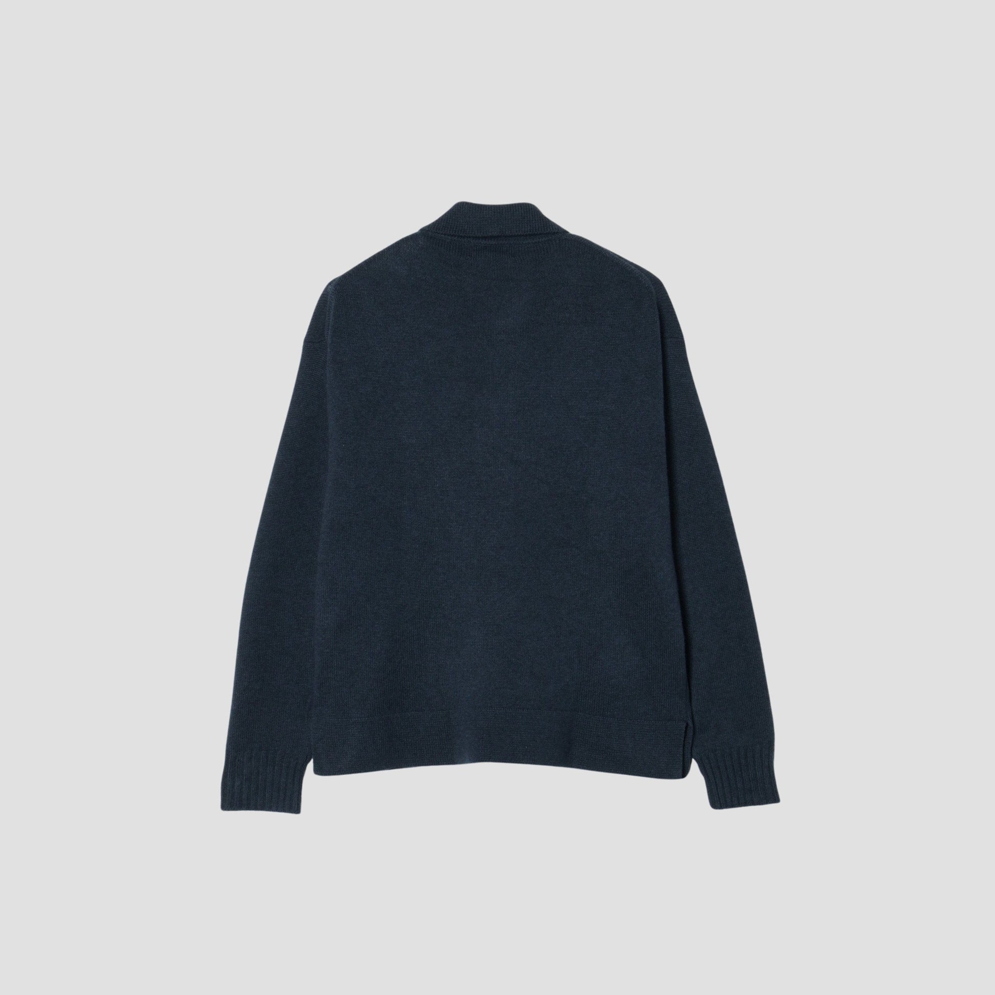 ウールカシミア素材のニットポロ。膨らみや柔らかなハンドリングが特徴。ドロップショルダーと着丈はやや短め設計のボクシーシルエット。