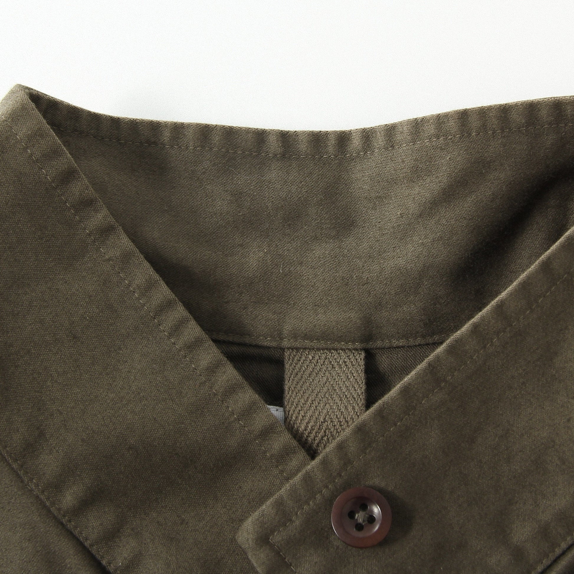 高密度に織られたコットン素材を使用したドレス。太めのスタンドカラーやシンチバック、大きな胸ポケットが特徴的なデザイン。