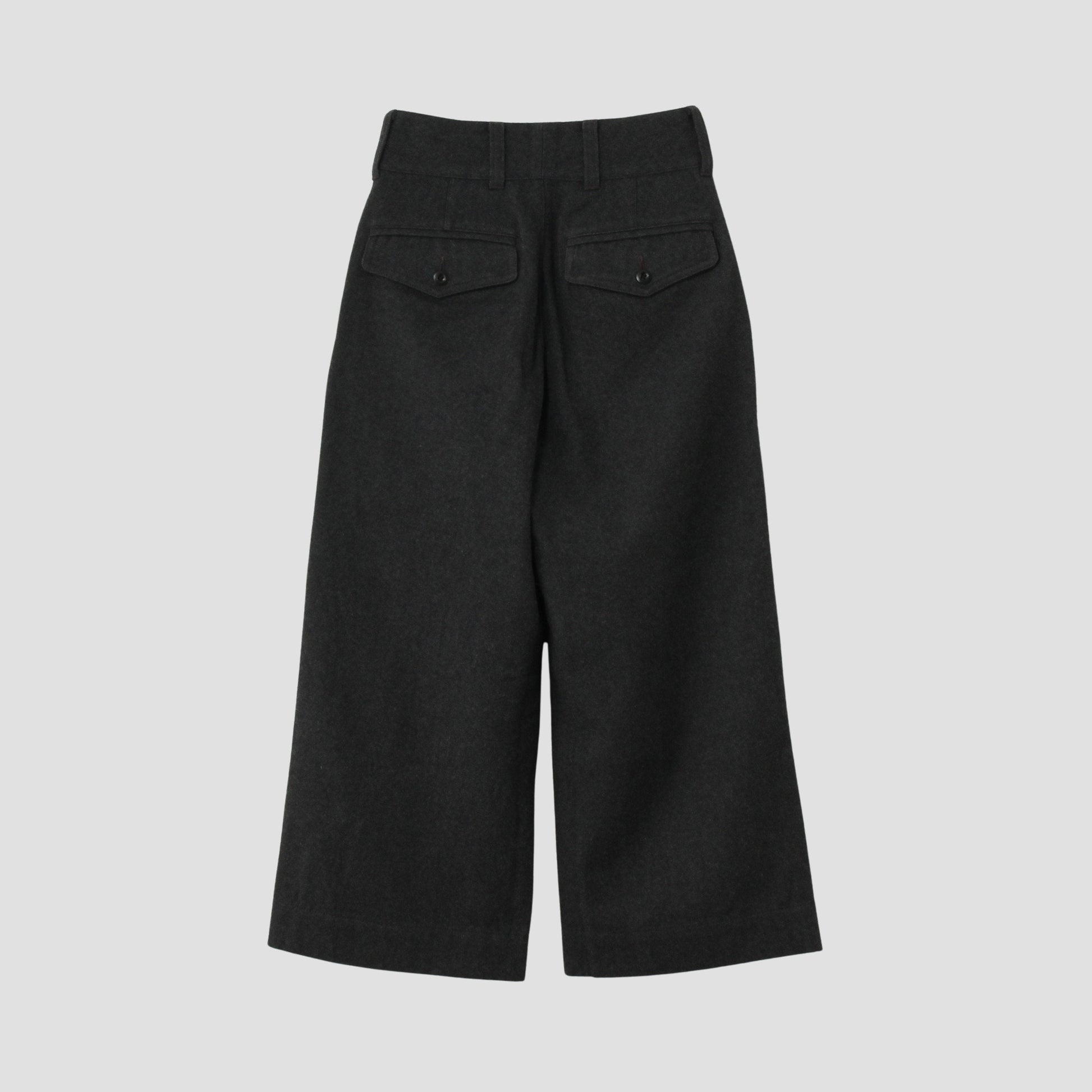 張りコシのあるウールコットン素材のクロップドトラウザーズ。