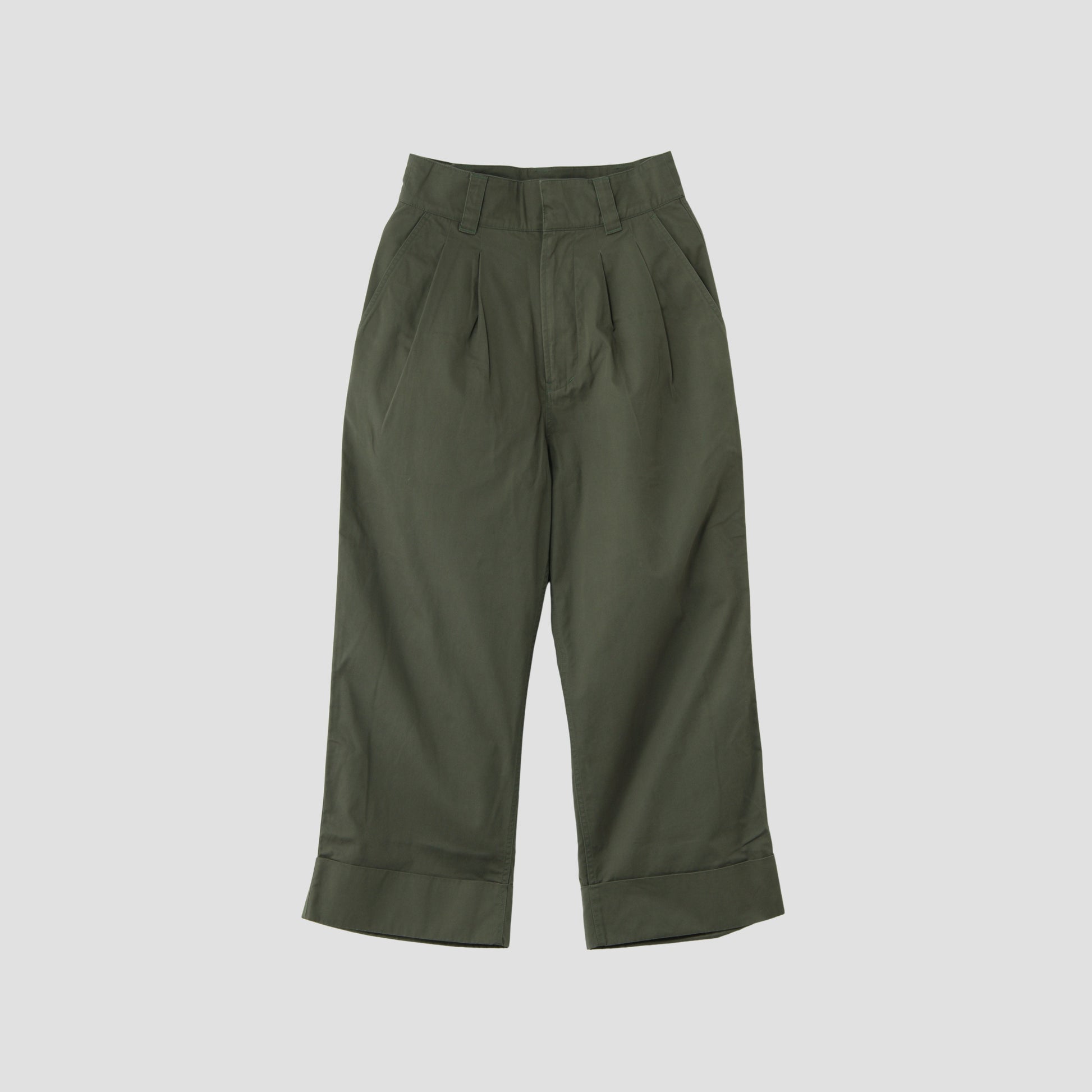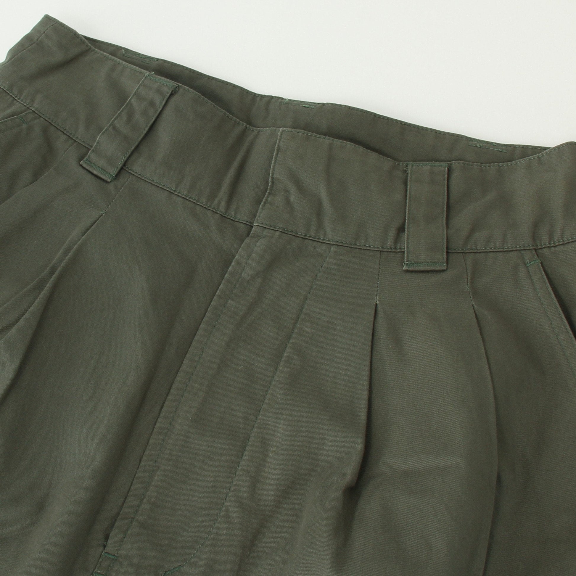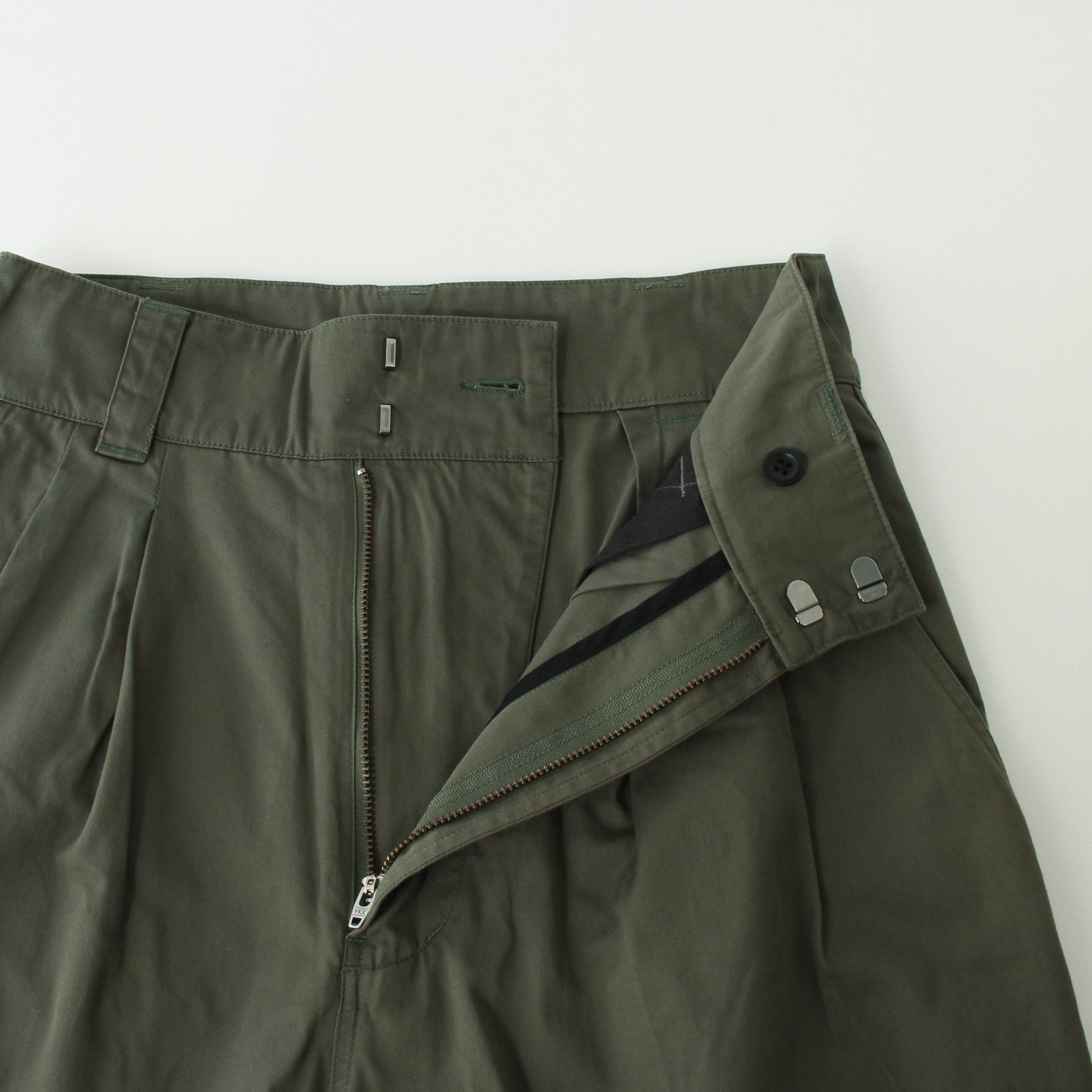 ウォーム感のあるコットン素材のトラウザーズ。製品洗いによって生まれる縫い目のしわや、生地のしっとりとした風合いが特徴。ヴィンテージアイテムからインスパイアされたウエストにタックが入ったワイドシルエットのスタイルを採用。バックポケットのフラップにはドットボタンを使用し、フロントはタフなフックとジップでMHL.らしいキャラクターをプラス。