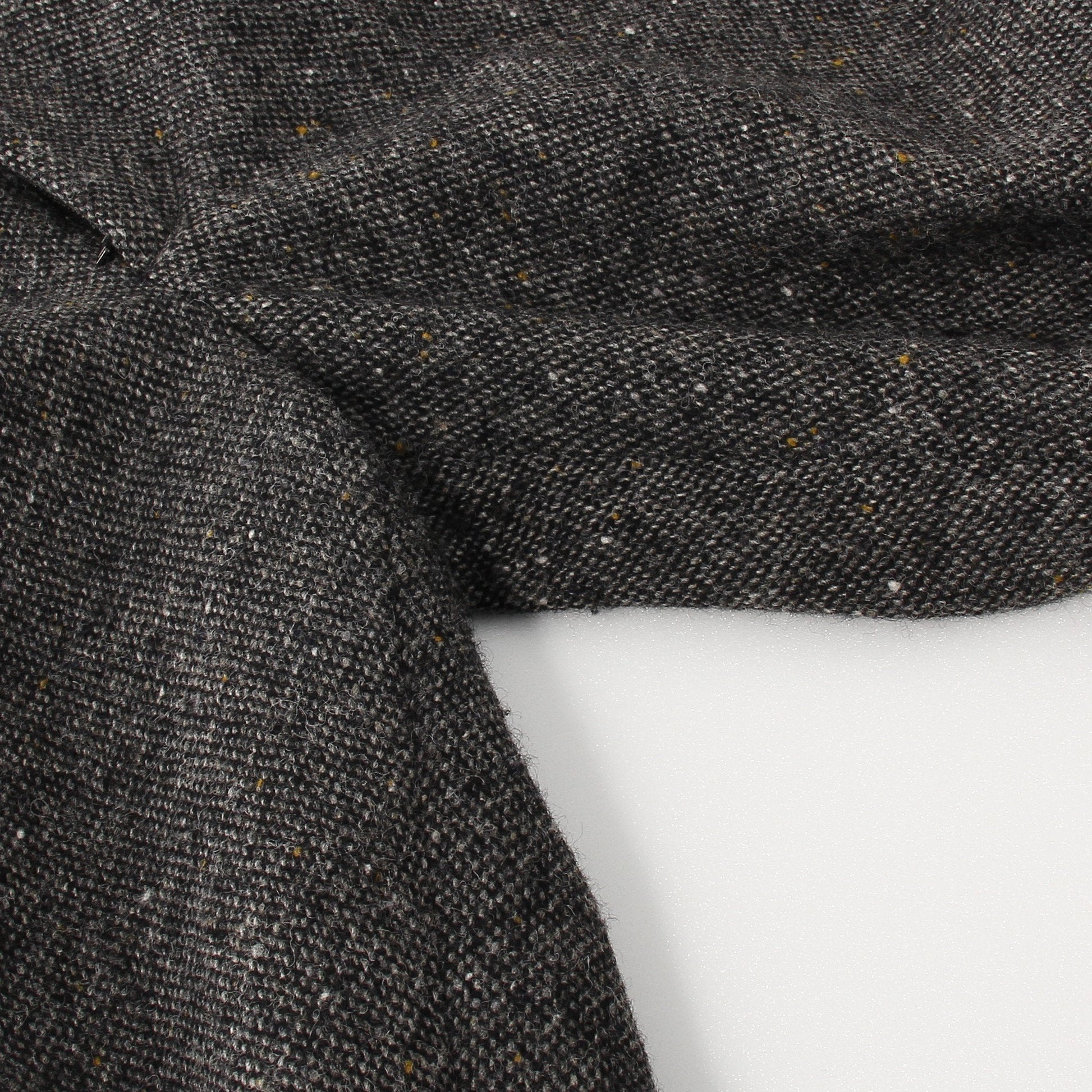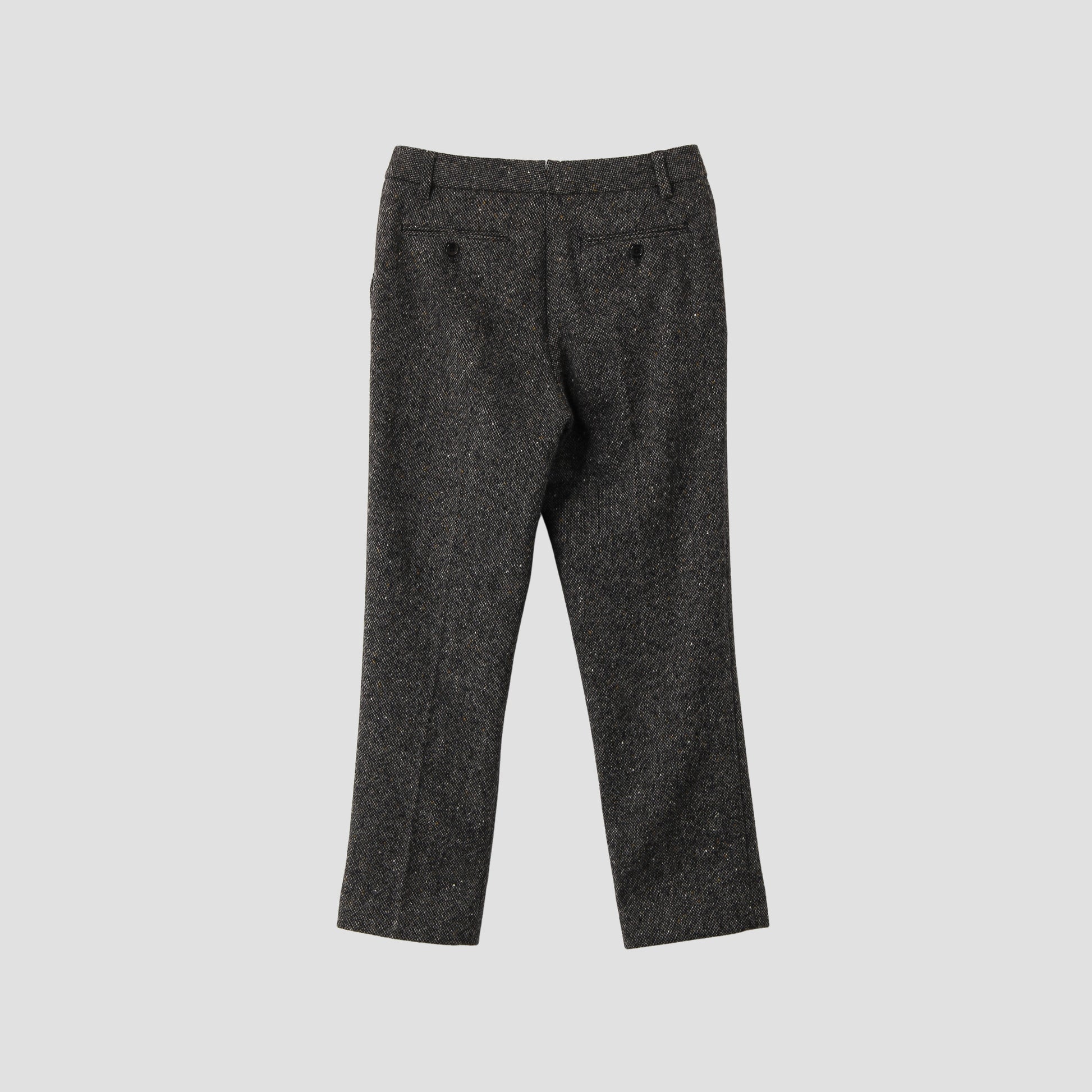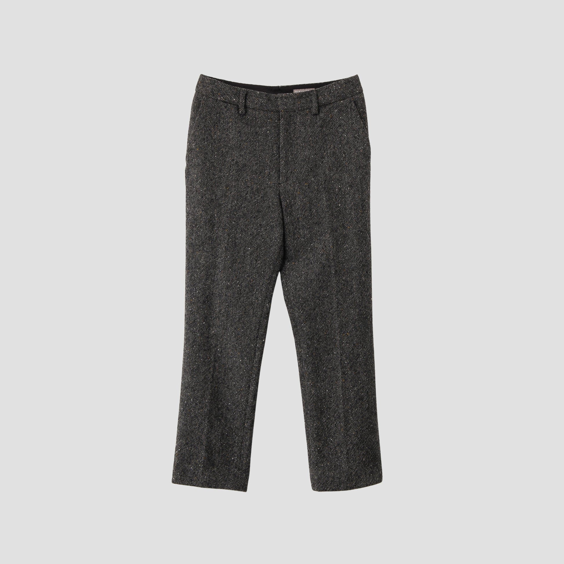 細かいホワイト、ブラック、イエローのネップが特徴的なツイード素材のトラウザーズ。