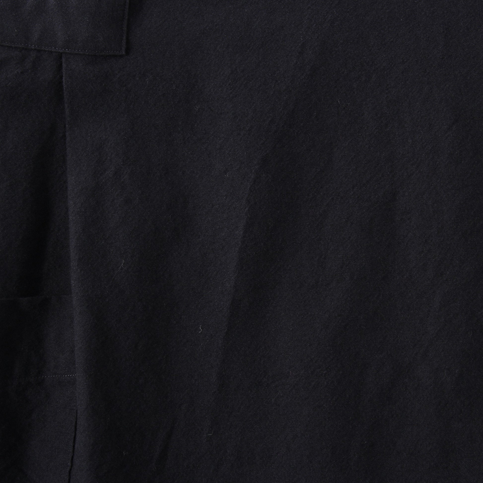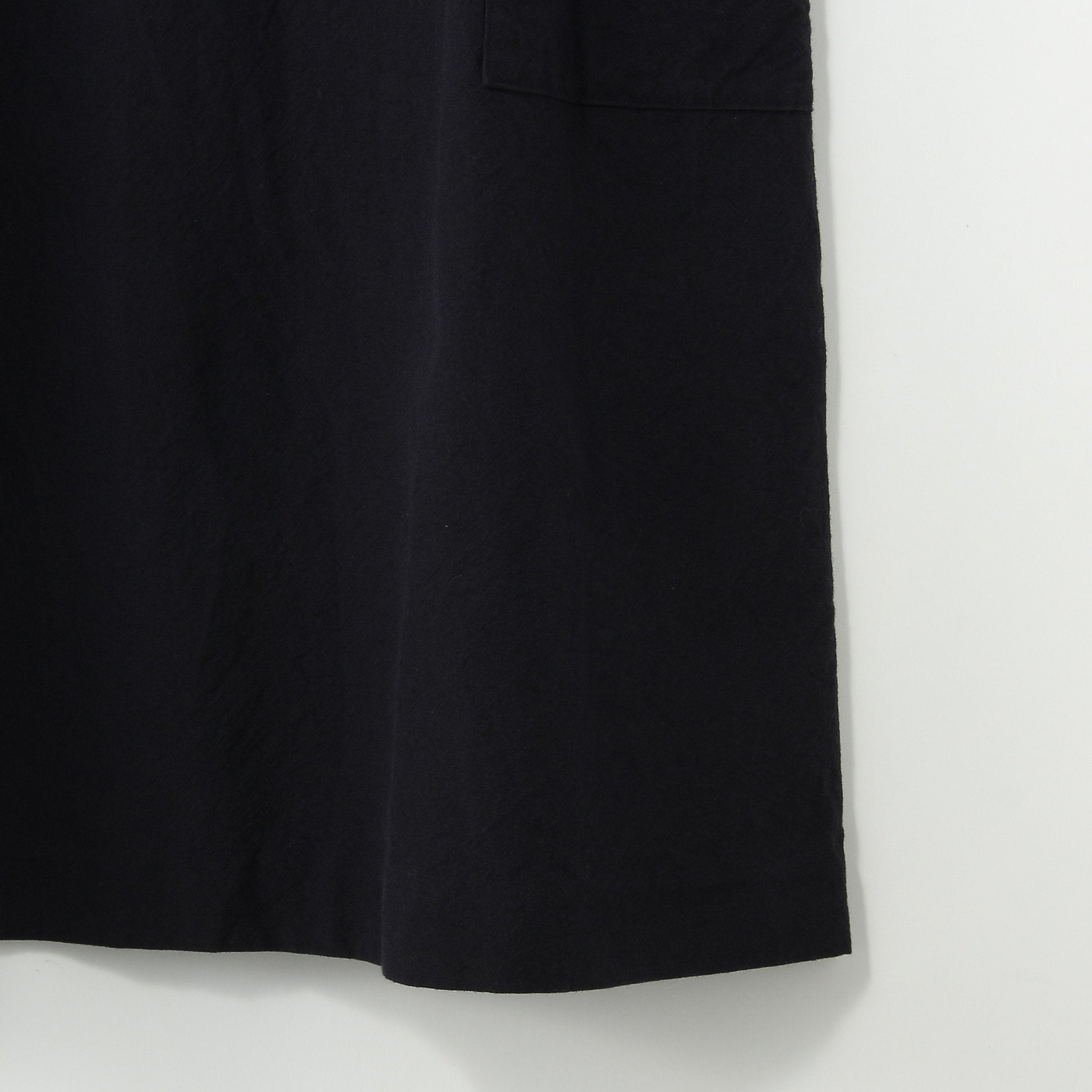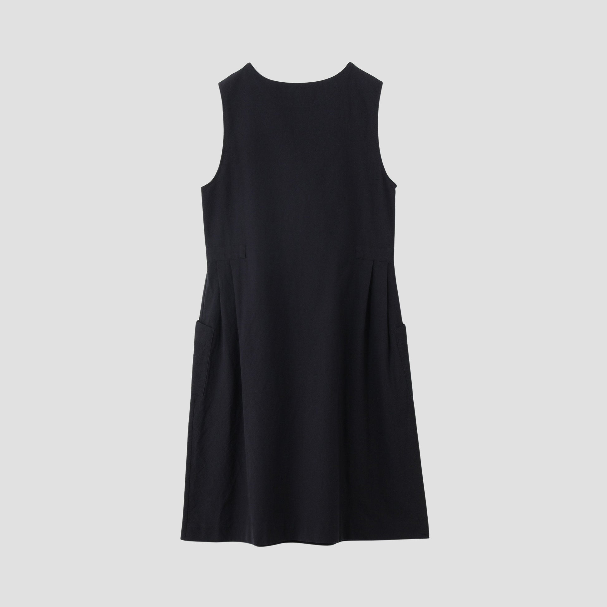 程よい肉感のウールとコットンの交撚糸を使用した素材のドレス。ワッシャー加工やマットな表面感でタフな印象。プリーツとパッチポケットのディテールや、ショルダー部分の釦ディテールなどキャラクターのある1着。