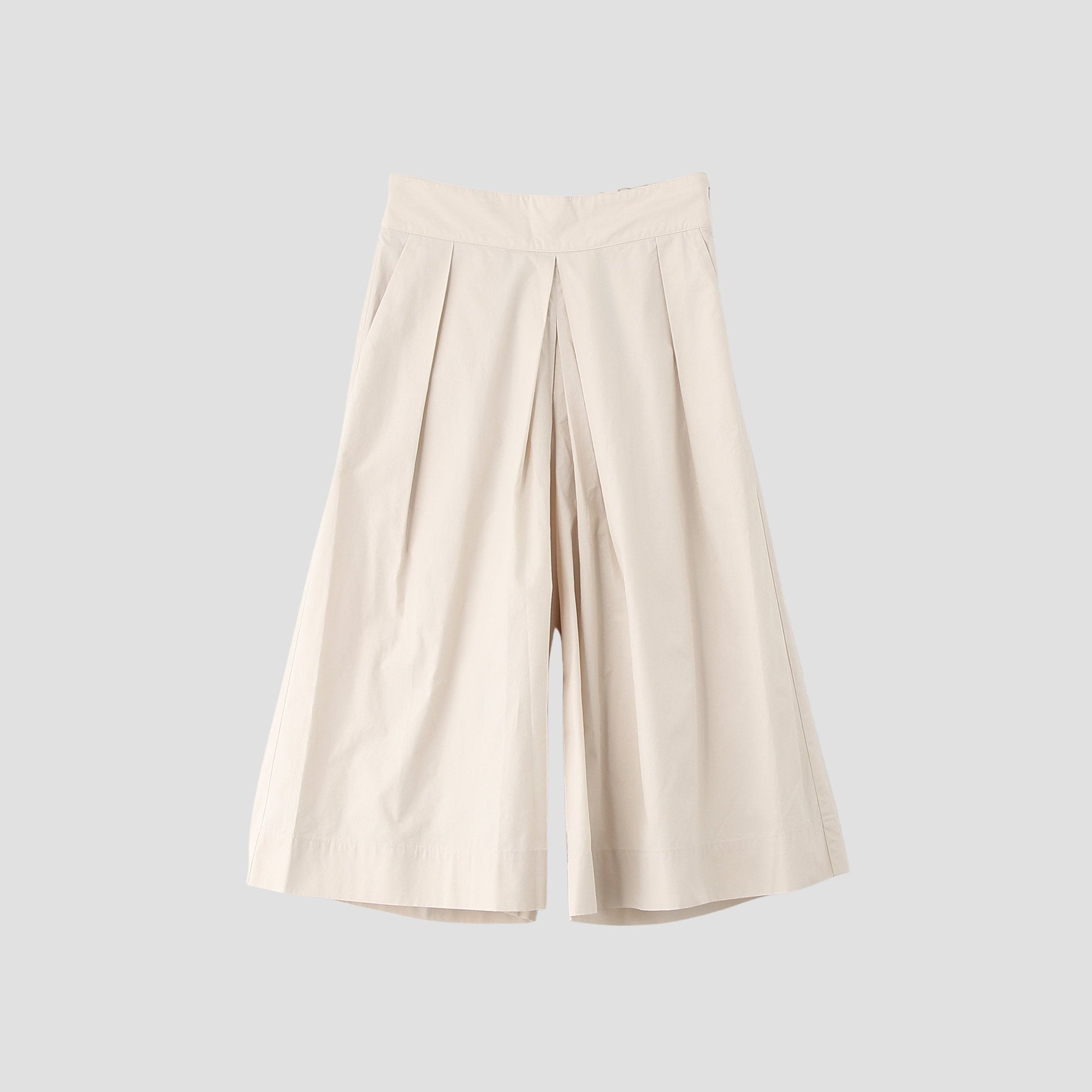 上質なコットンを使用したキュロットトラウザーズ。滑らかな肌触りと膨らみが特徴の柔らかな風合い。長めの着丈と深く入ったタックがスカートライクなデザインで、ウエストは後ろがイージーに着用できる設計。夏に適したキャラクターのある一枚。
