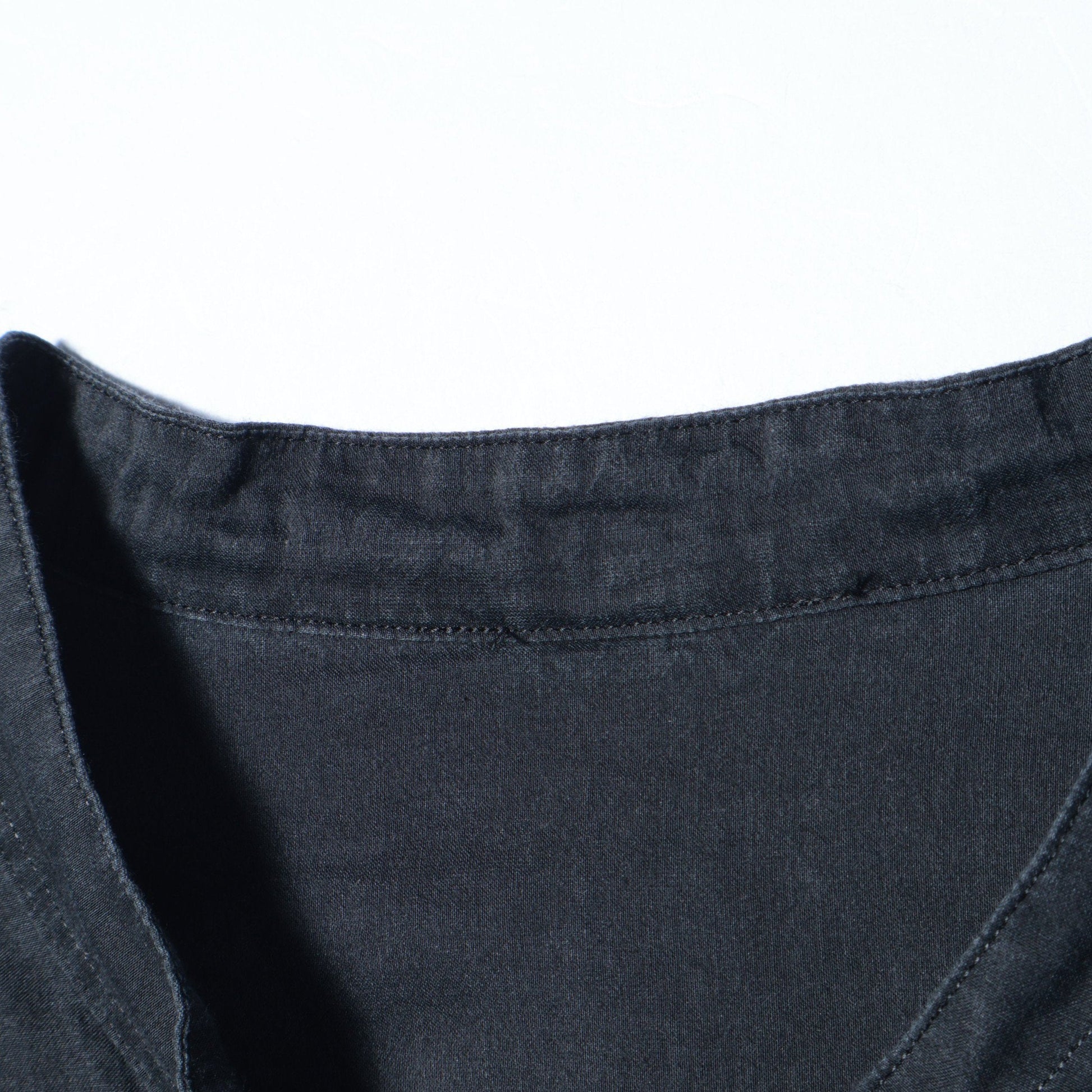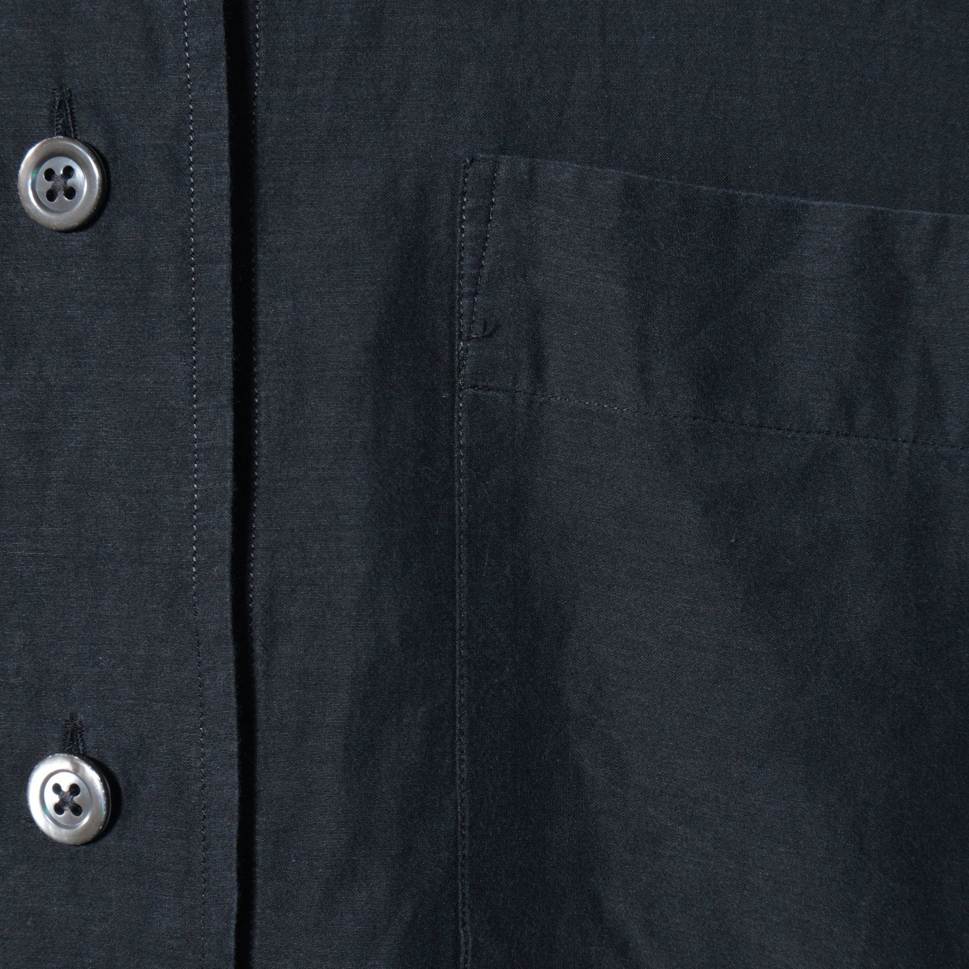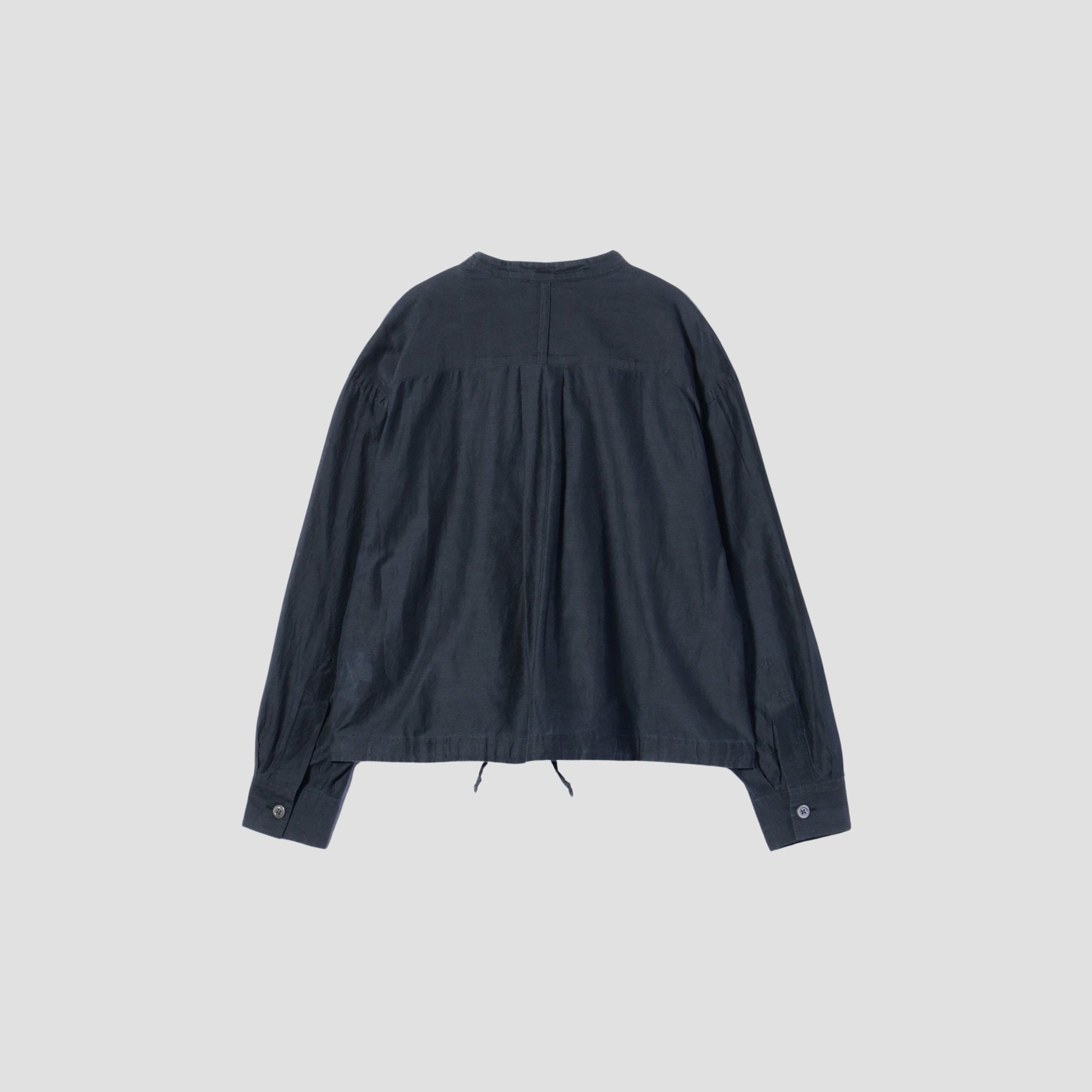 コットンとシルクを使用したシャツ。張りと透明感のあるきれいめな素材のシャツに製品洗いでラフな表情をプラス。ドロスト仕様の裾は、絞ることでスタイリングの幅が広がる特徴的なデザイン。太い前立てや、大きめのボタンでモダンにアレンジしたアイテム。