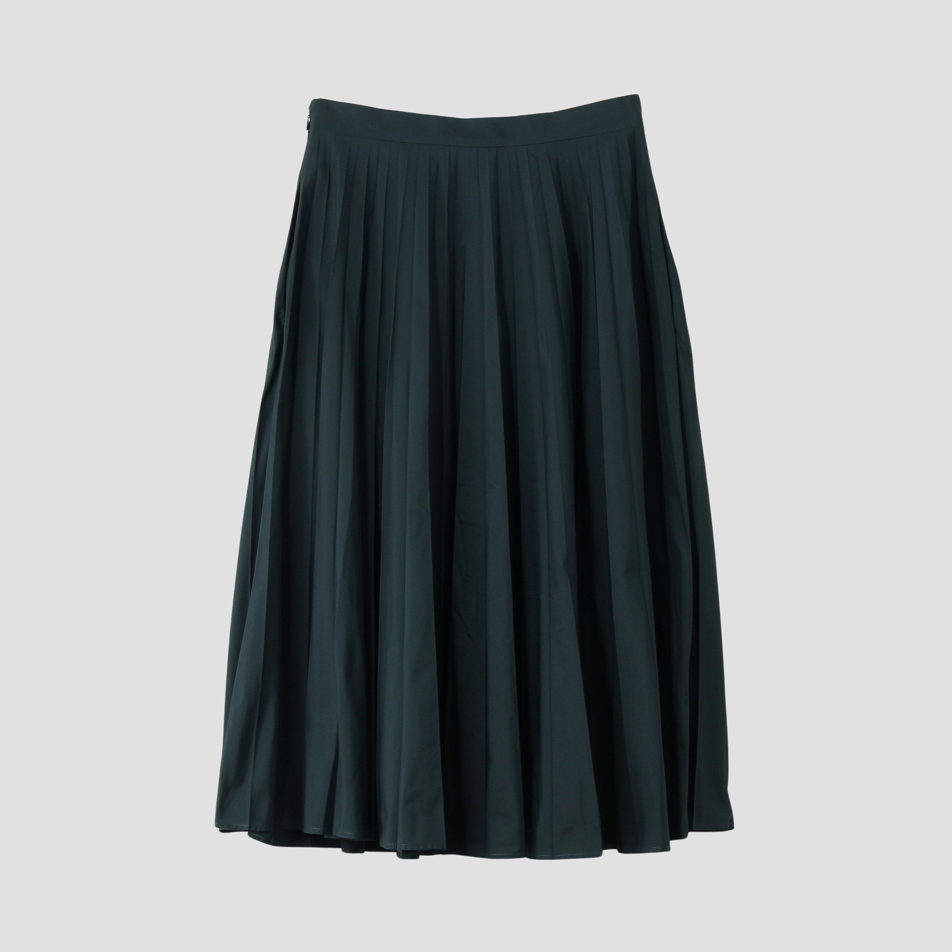 ポリエステル素材を使用したプリーツスカート。青味のあるグリーンのカラーが特徴で、様々なスタイルに幅広く合わせられる一着。