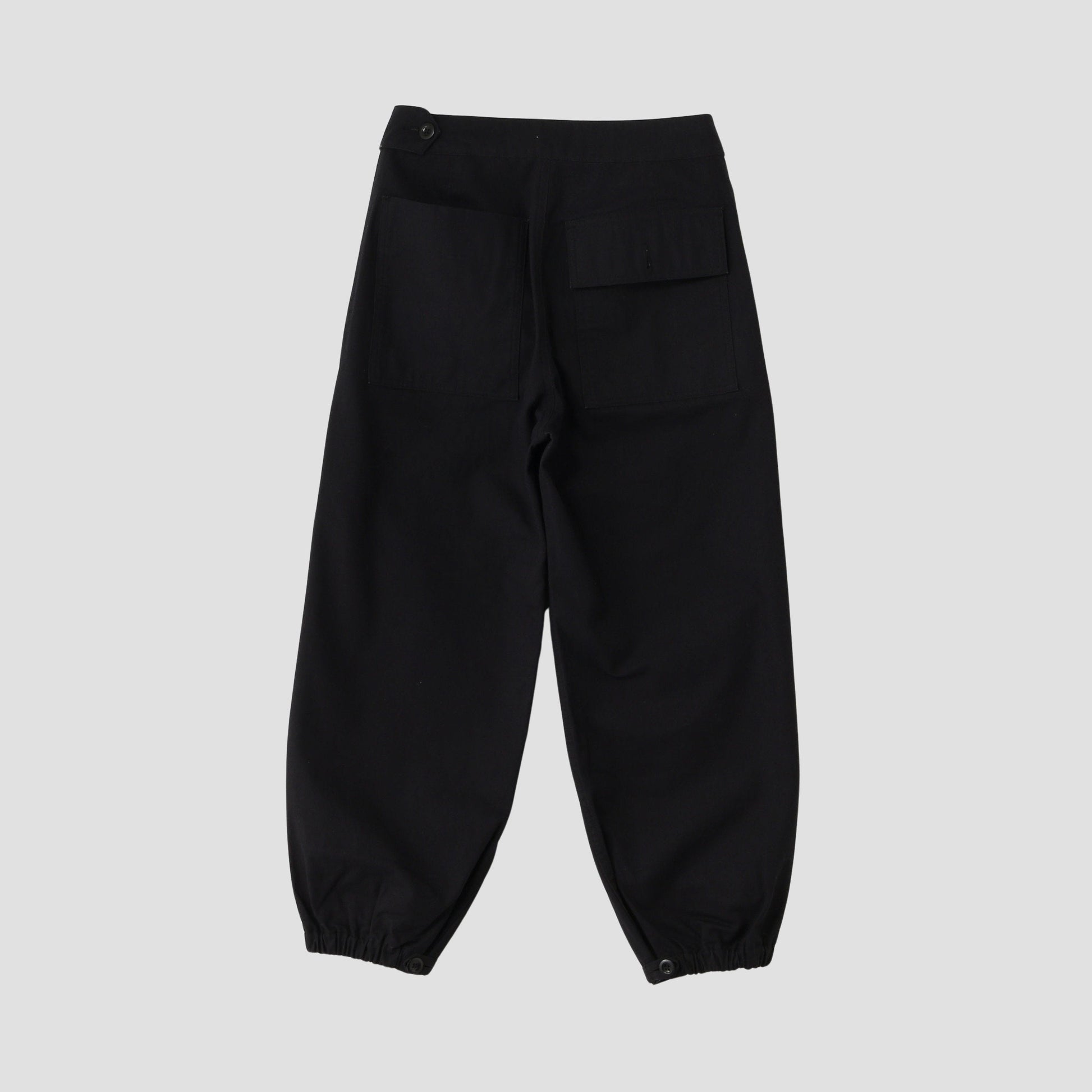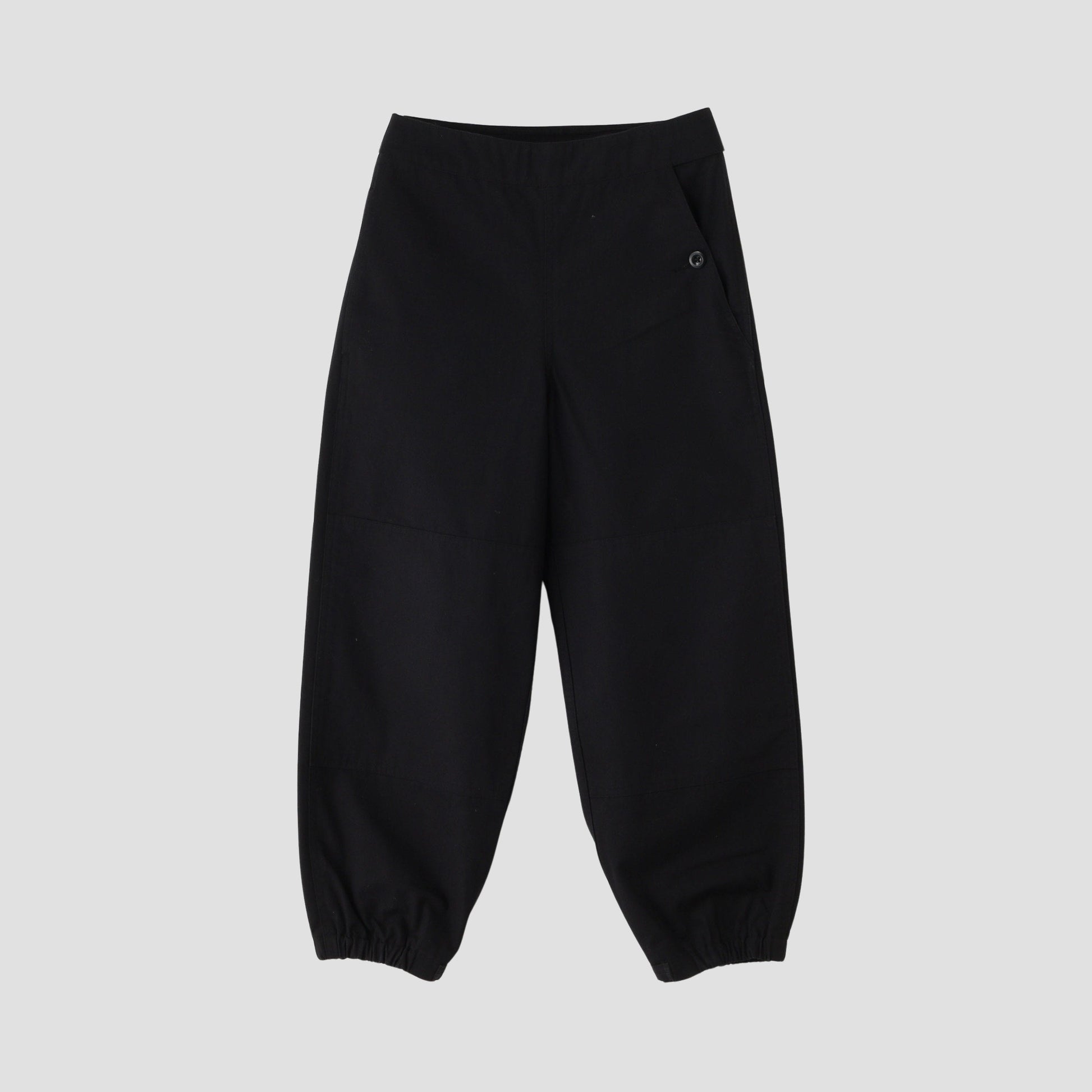 高密度に織り上げたドライ感のあるコットン素材のトラウザーズ。ニーパッチと裾のゴムシャーリングにより、新鮮なシルエットのアイテム。