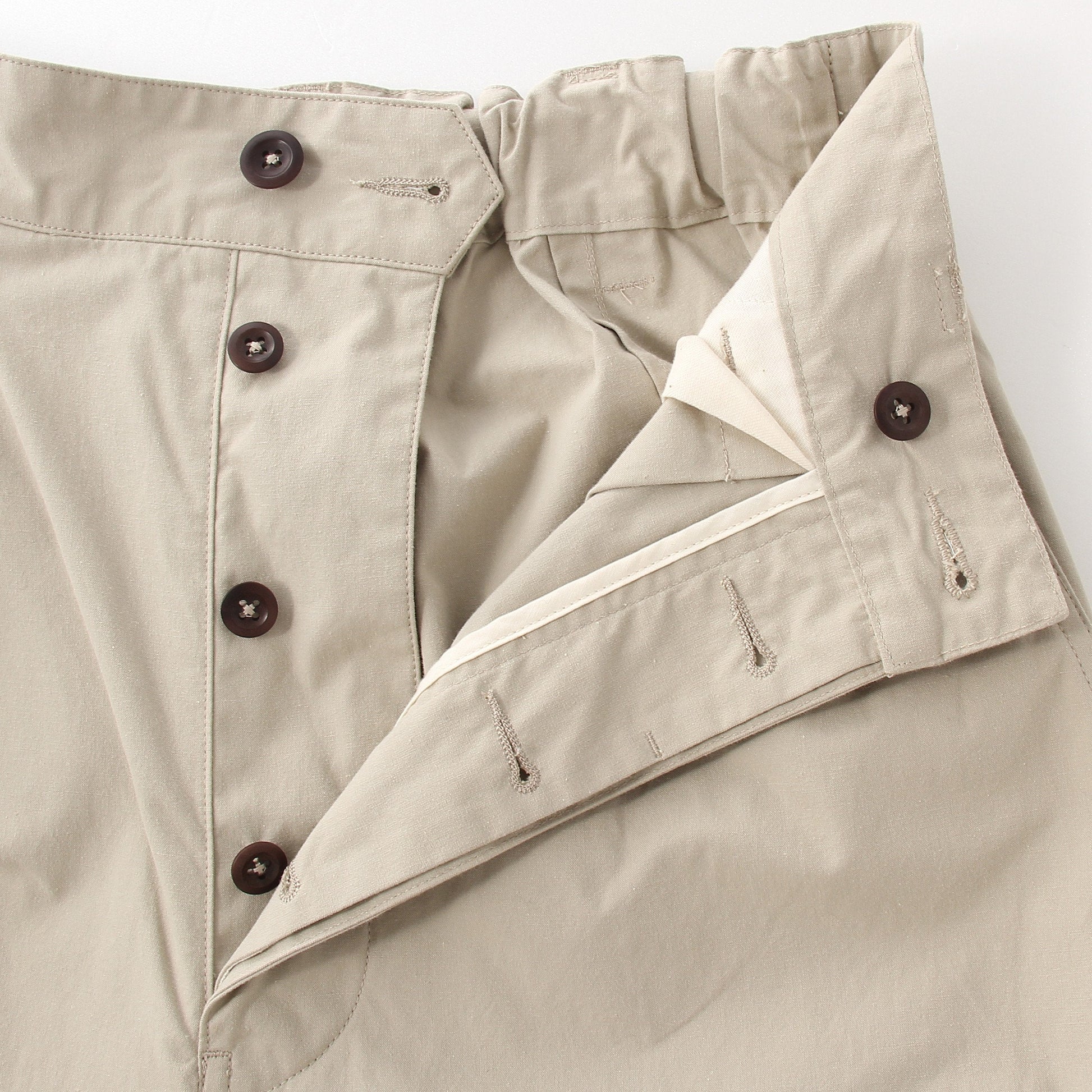 適度にムラのあるコットン糸を使用したトラウザーズ。ヴィンテージライクな風合いで、生地に膨らみを持たせるために高密度に織り上げているのが特徴。糸の良さを消さない工夫が随所に施されたこだわりの素材。きれいなワイドシルエットのデザインながらも、イージーなゴムギャザーウエストを採用。コインポケットやヒップの玉縁ポケットなどMHL.らしいキャラクターを持たせたアイテム。