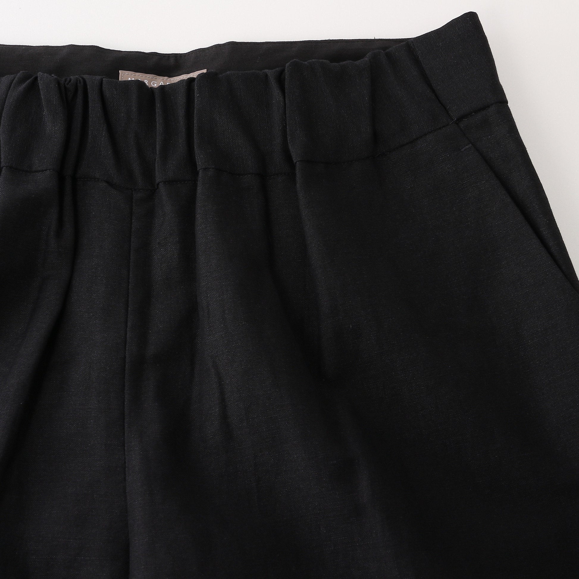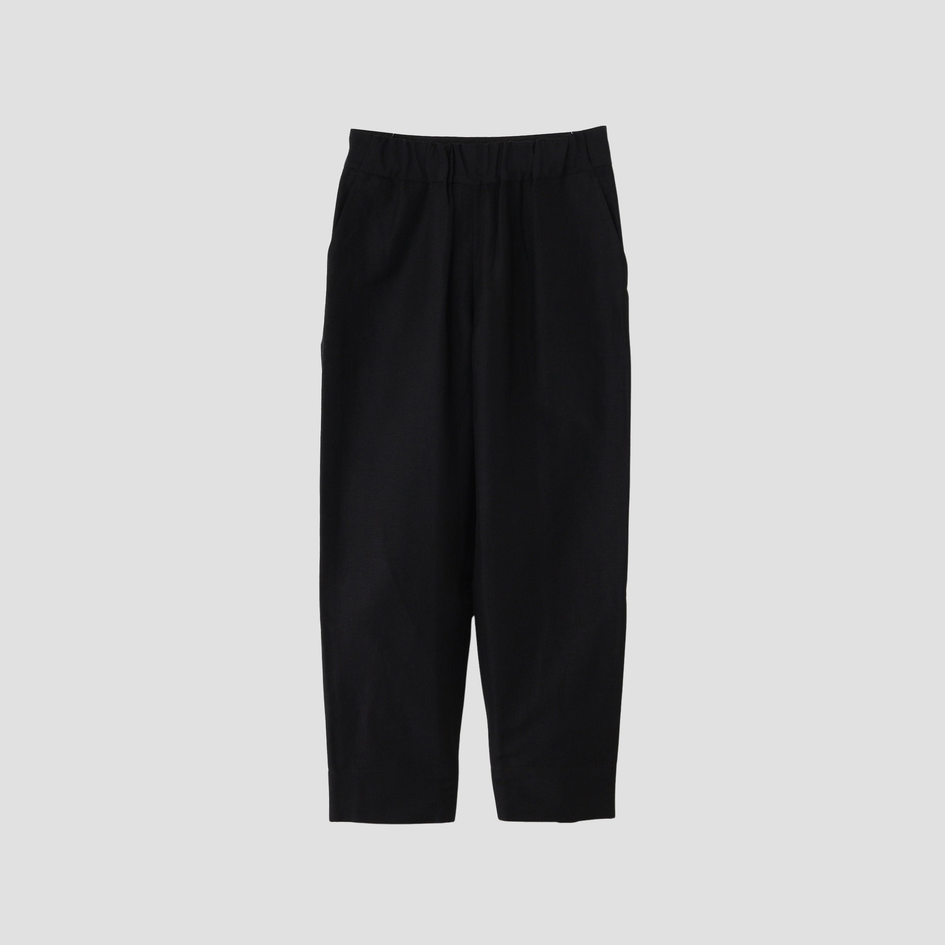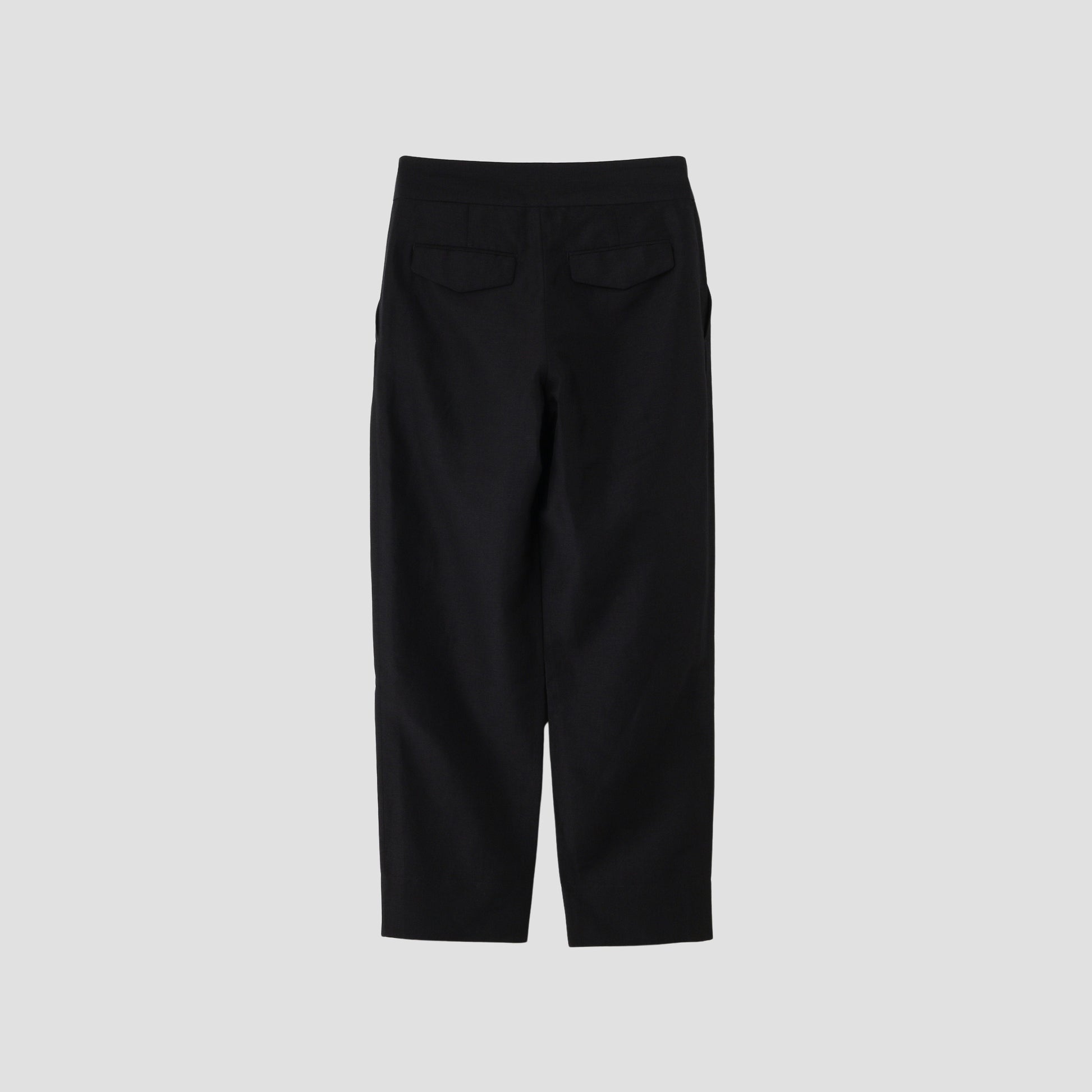 ウールリネン素材を使用したトラウザーズ。フロントデザインはドローコードによってギャザーが寄ったリラックスした雰囲気。バックスタイルはフラップ付きの玉縁ポケットを配し、テーラードの要素を取り入れたアイテム。