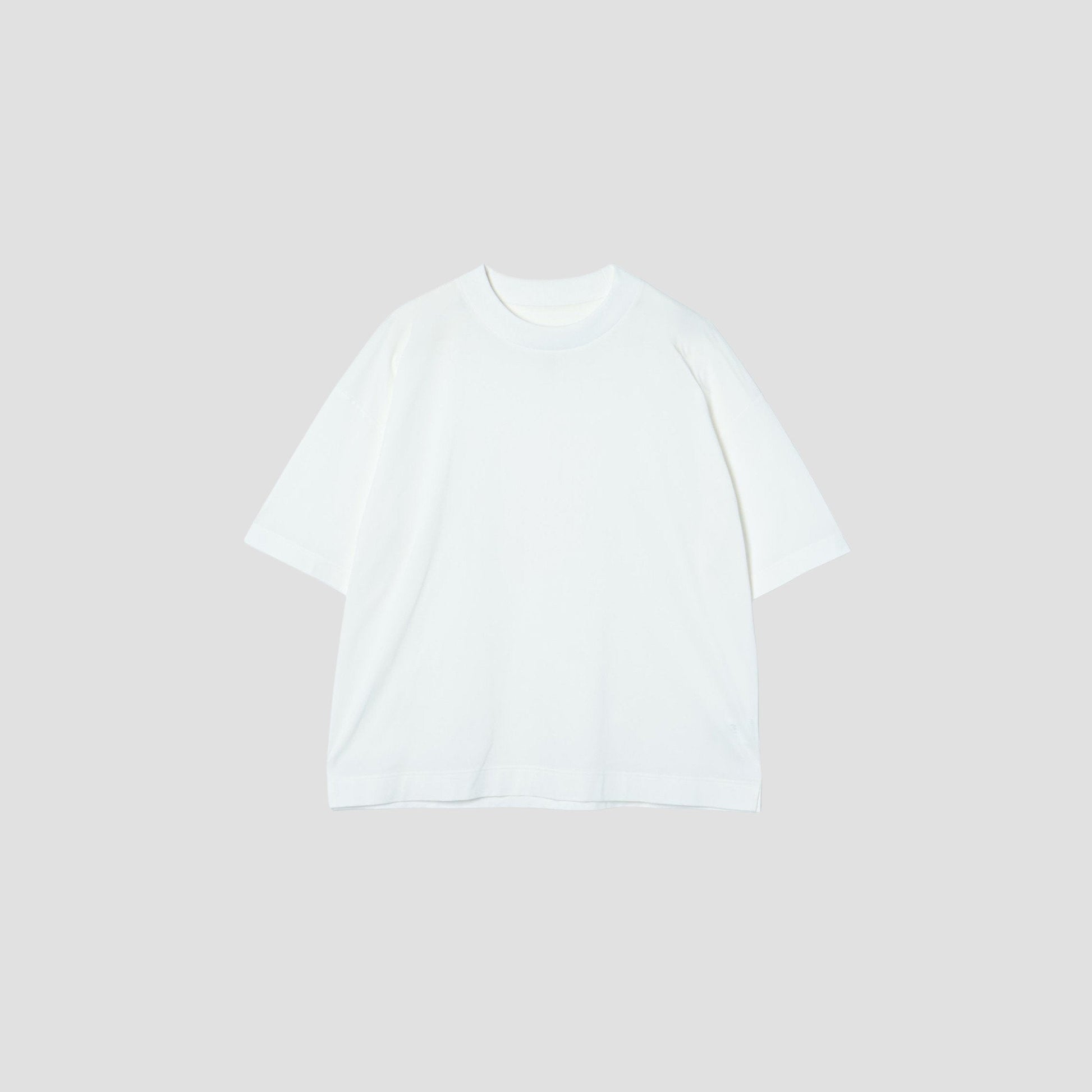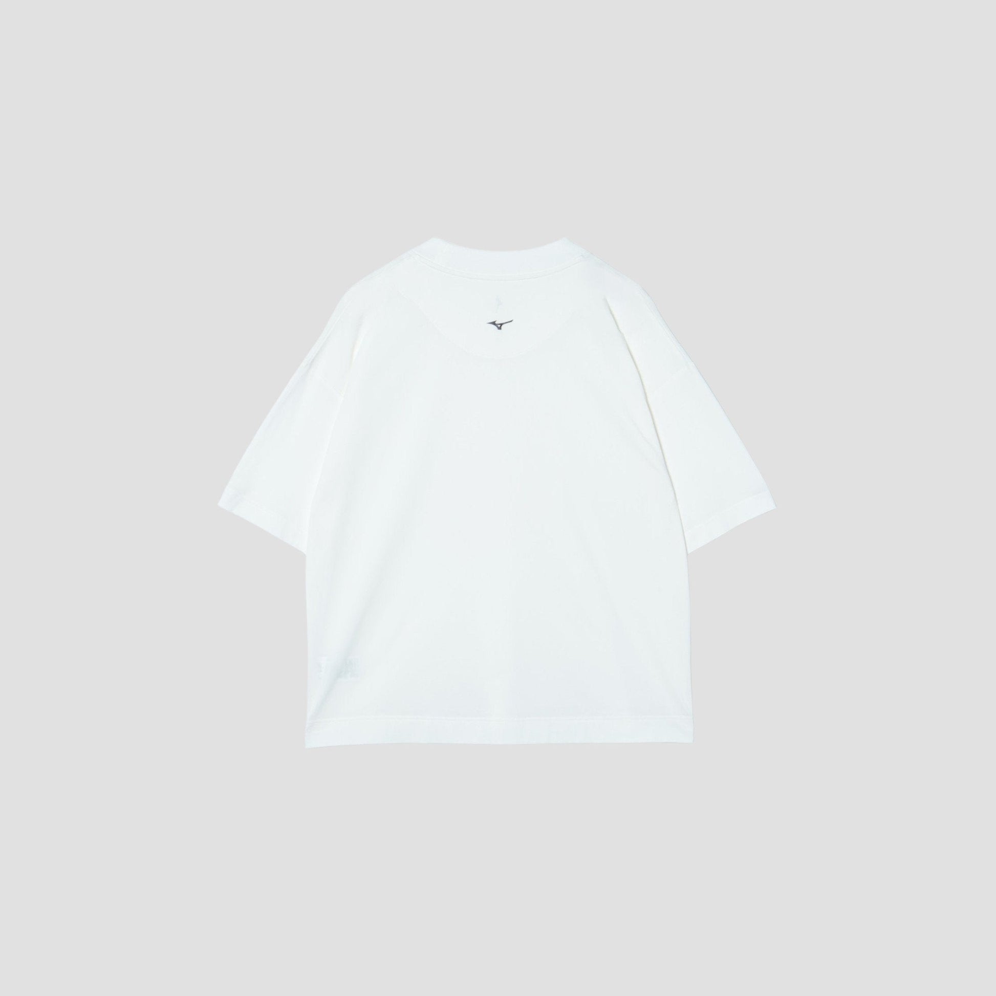 ミズノの高い技術力とマーガレット・ハウエルの感性を融合させてコレクション「MIZUNO FOR MARGARET HOWELL」。伸縮性のある複合繊維を46ゲージのハイゲージで編み上げた素材。ハリとコシのある風合いが特徴。内側には細番手のコットンを採用し、天然繊維の心地よい肌触り。ドロップショルダーとゆったりしたワイドなシルエットに、太めのリブ襟巾がアクセントのTシャツ。