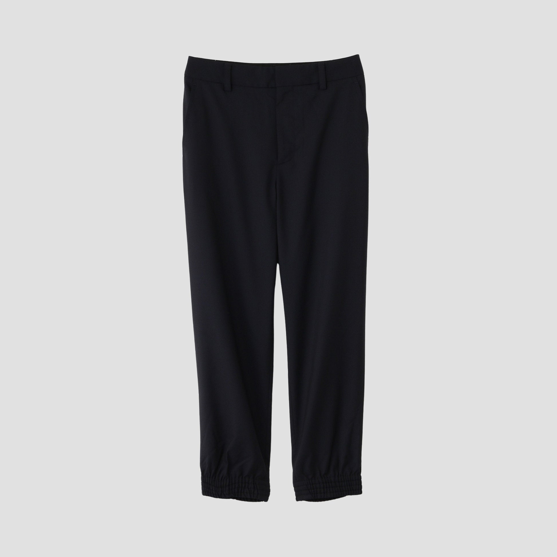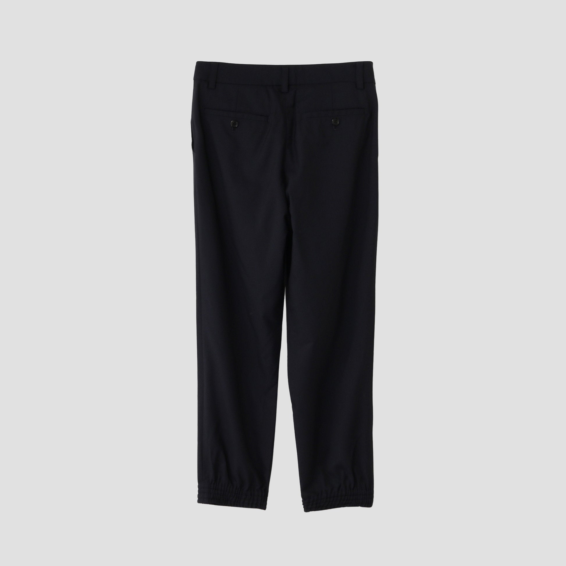 ウール素材のトラウザーズ。裾がリブ仕様。
