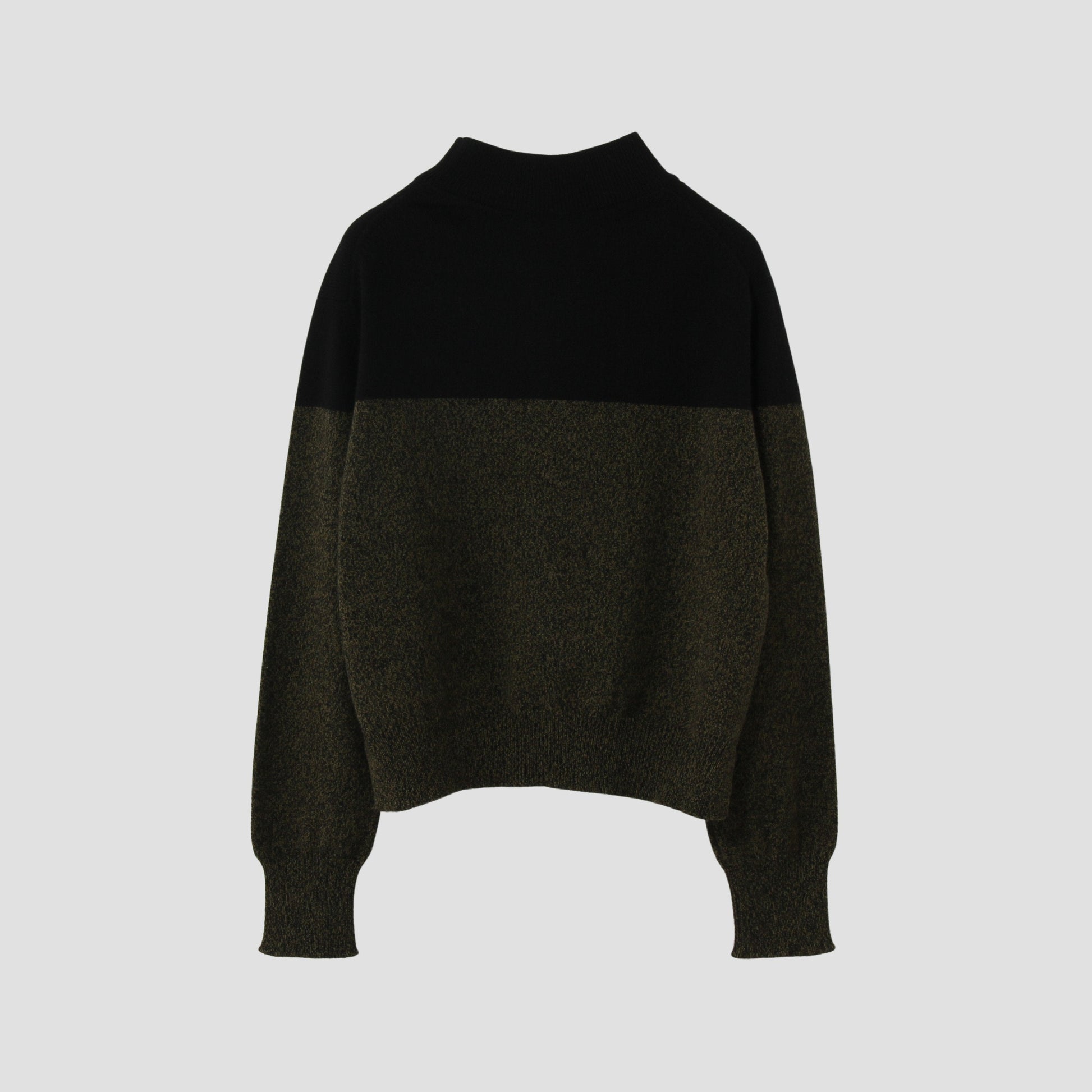 ハイネックのデザイン、ツートーンのカラーが特徴的なアイテム。