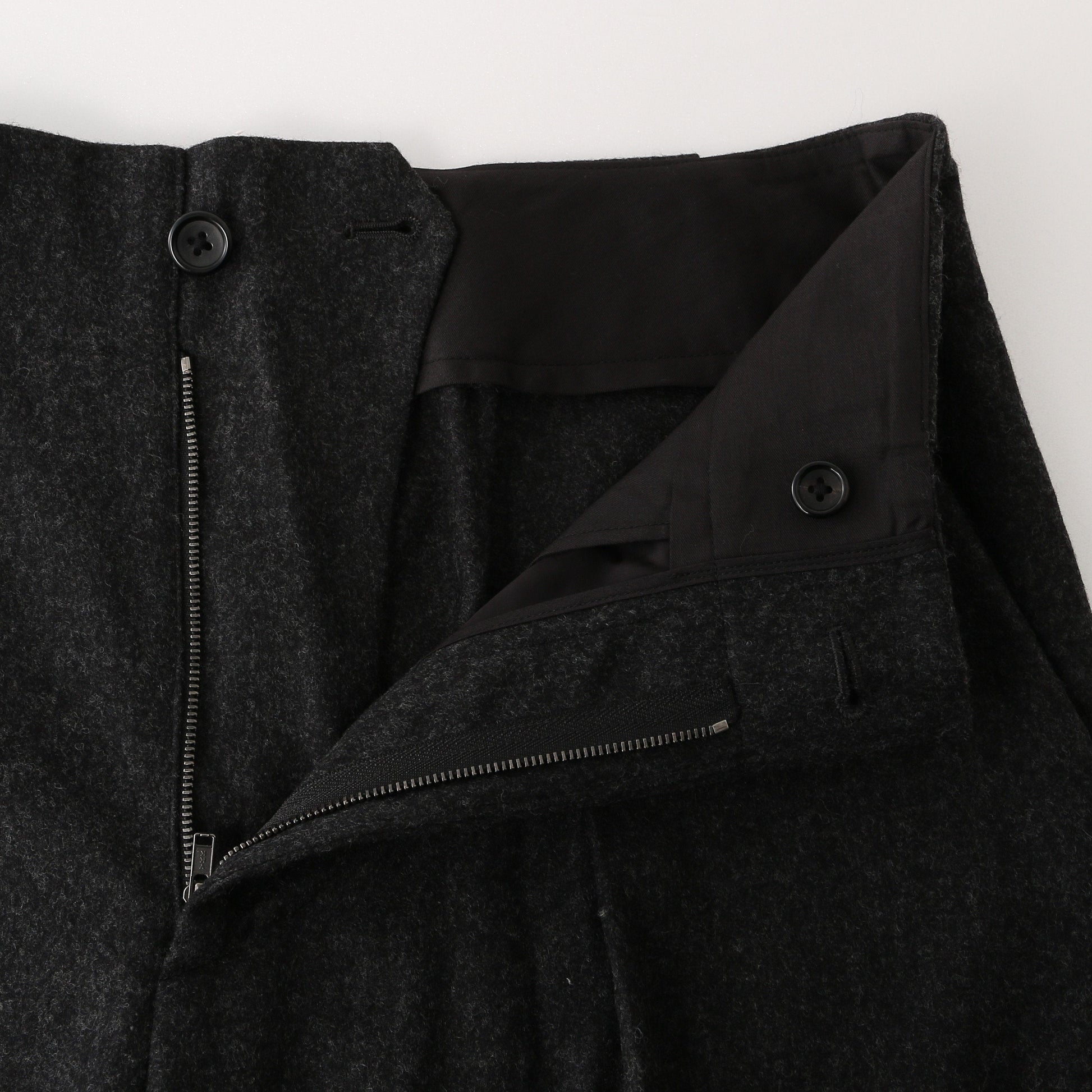 FOX BROTHERS社製のフランネル素材を使用したトラウザーズ。太めのベルトループや、フロントのボックスプリーツなど、ミリタリーディテールを取り入れたシンプルなシルエット。