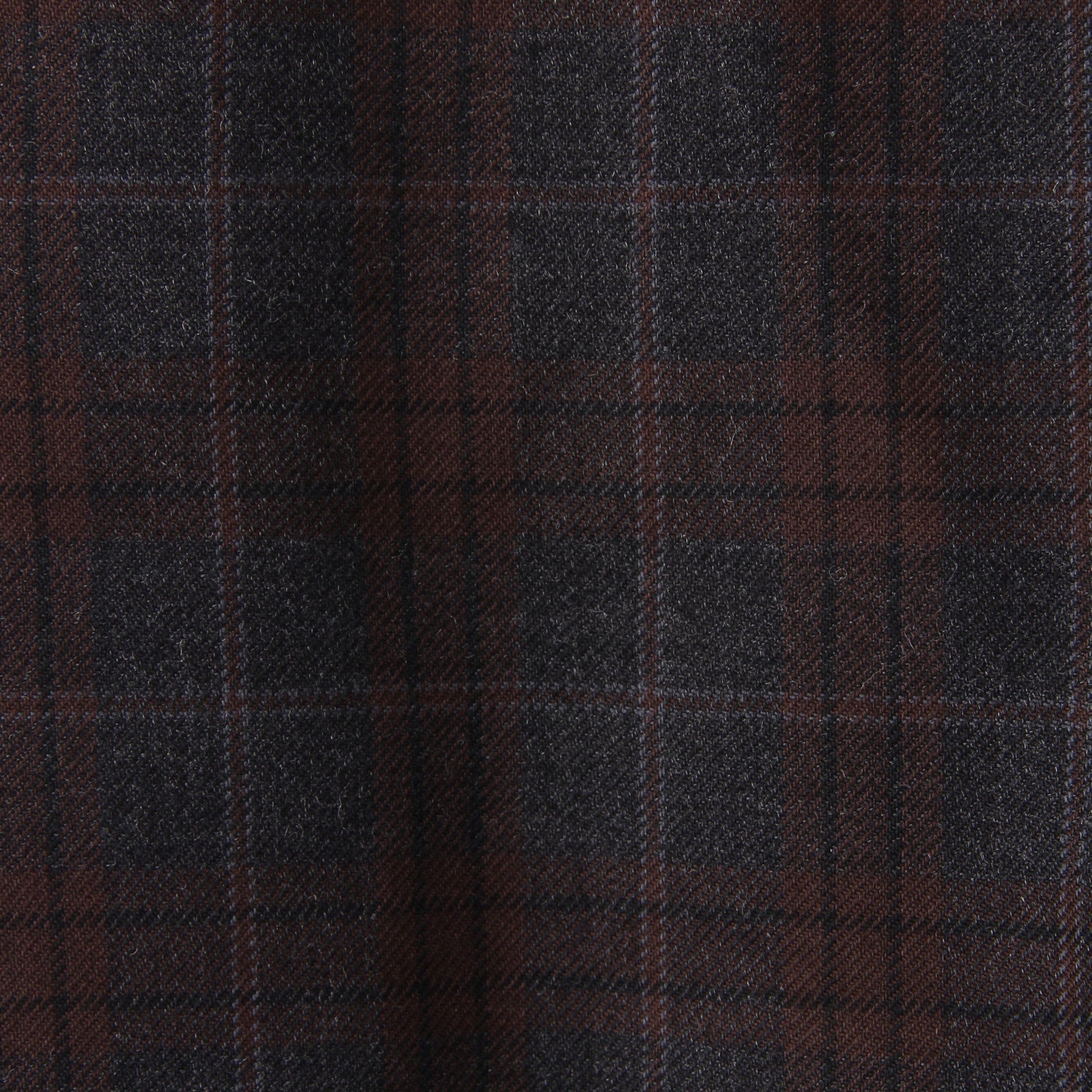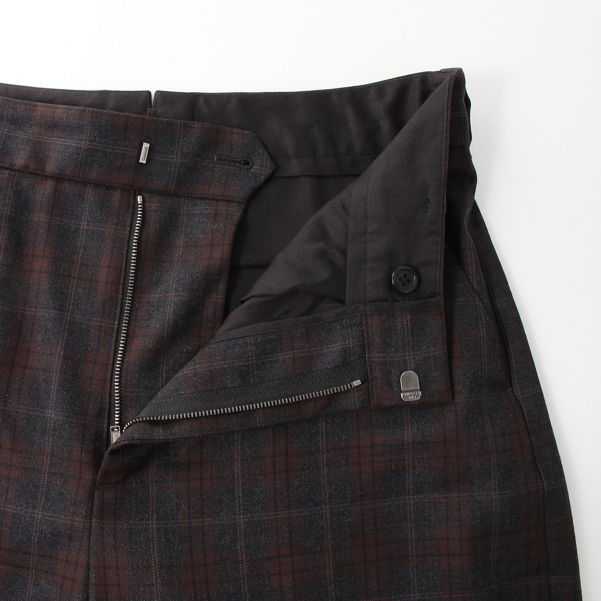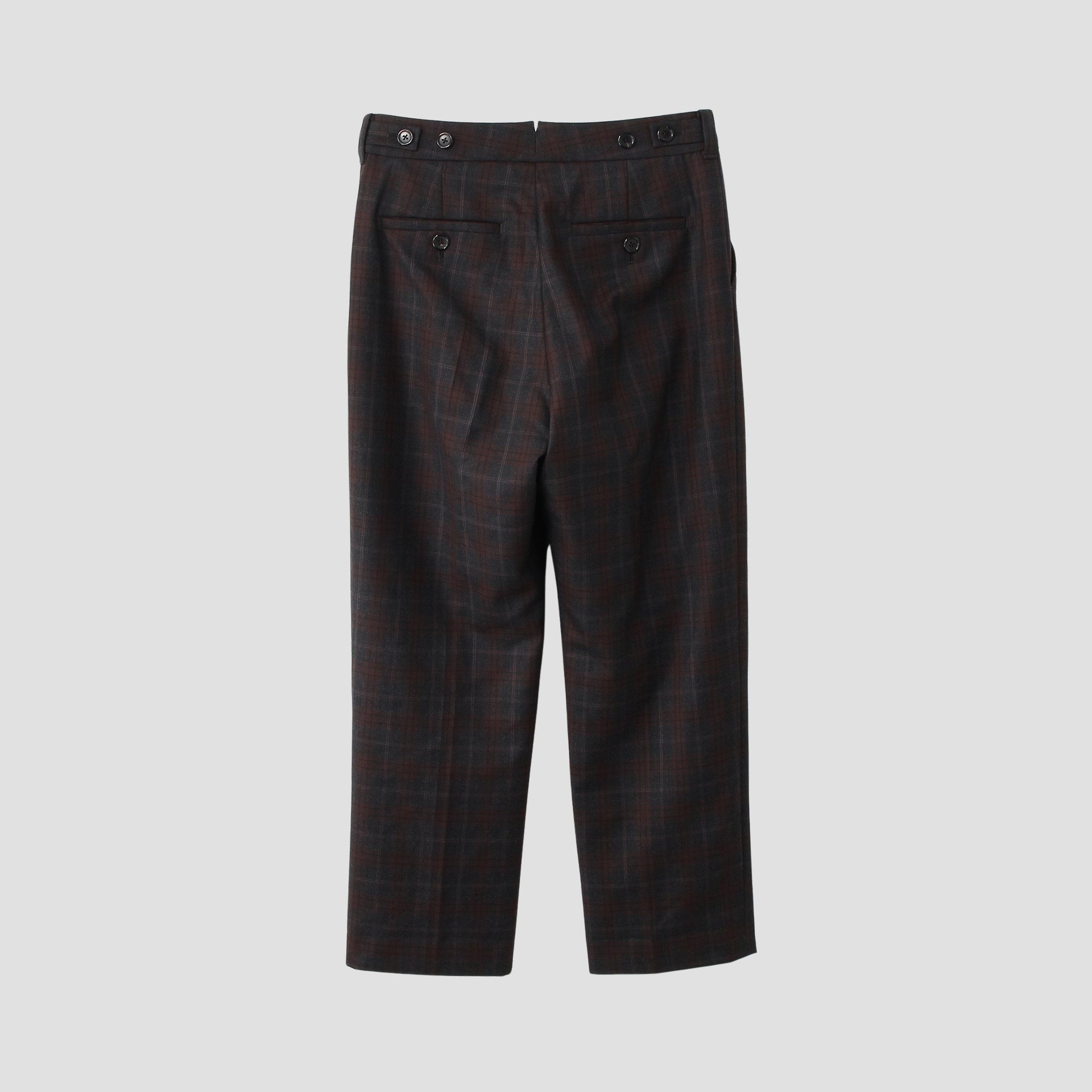 ウール素材を使用したトラウザーズ。サージ調のツイル組織で、落ち着いた色合いのチェック柄が特徴。ややゆとりのあるシルエットで、ウエスト周りをすっきりさせたデザイン。ウエストタブでサイズアジャストが可能。