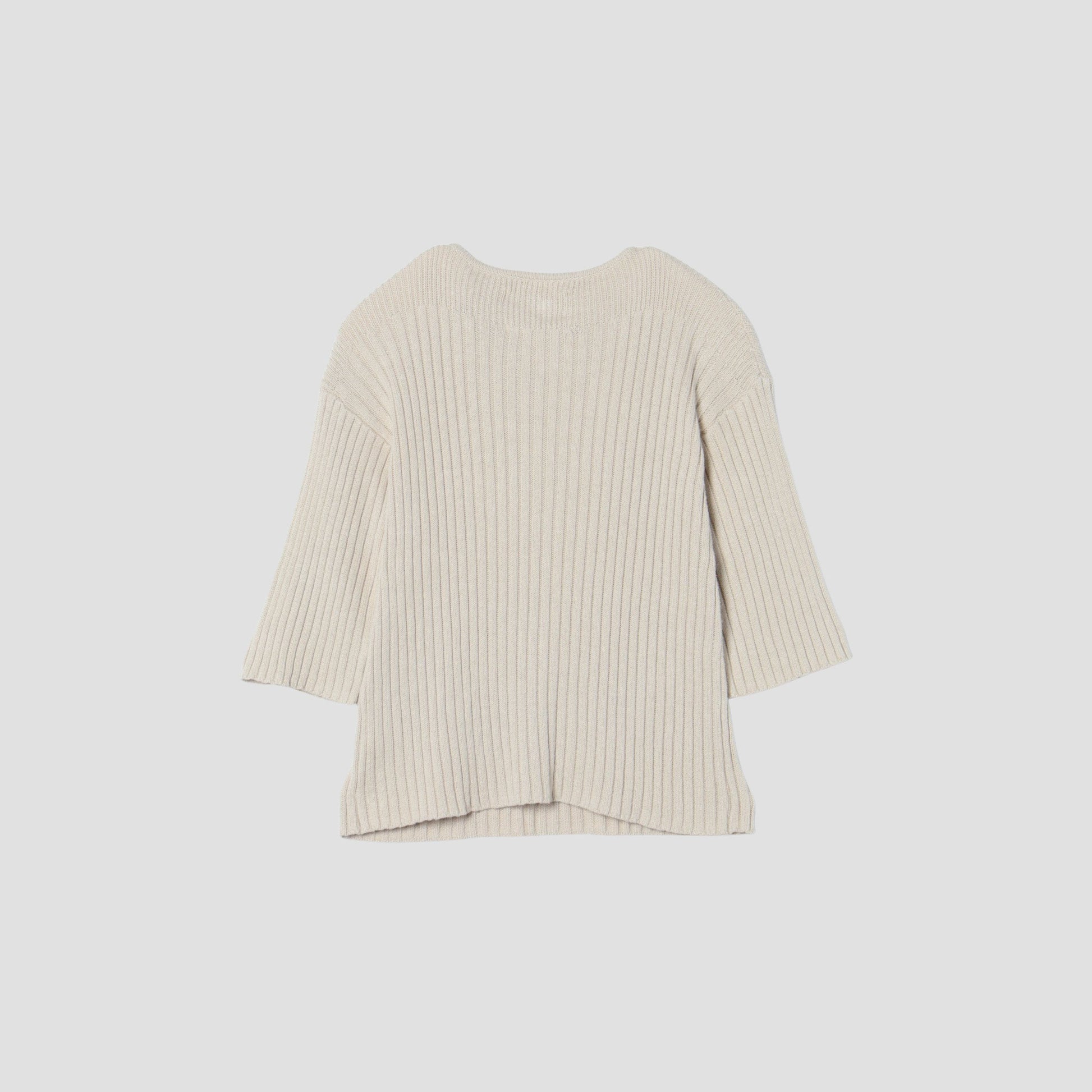 ドライタッチで毛羽の少ないコットンヘンプを使用したニット。長めのハーフスリーブのデザインが特徴で、ボディのワイドリブとヨーク部分の編地変化や、衿の表出しリンキングのコンビネーションが新鮮なアイテム。