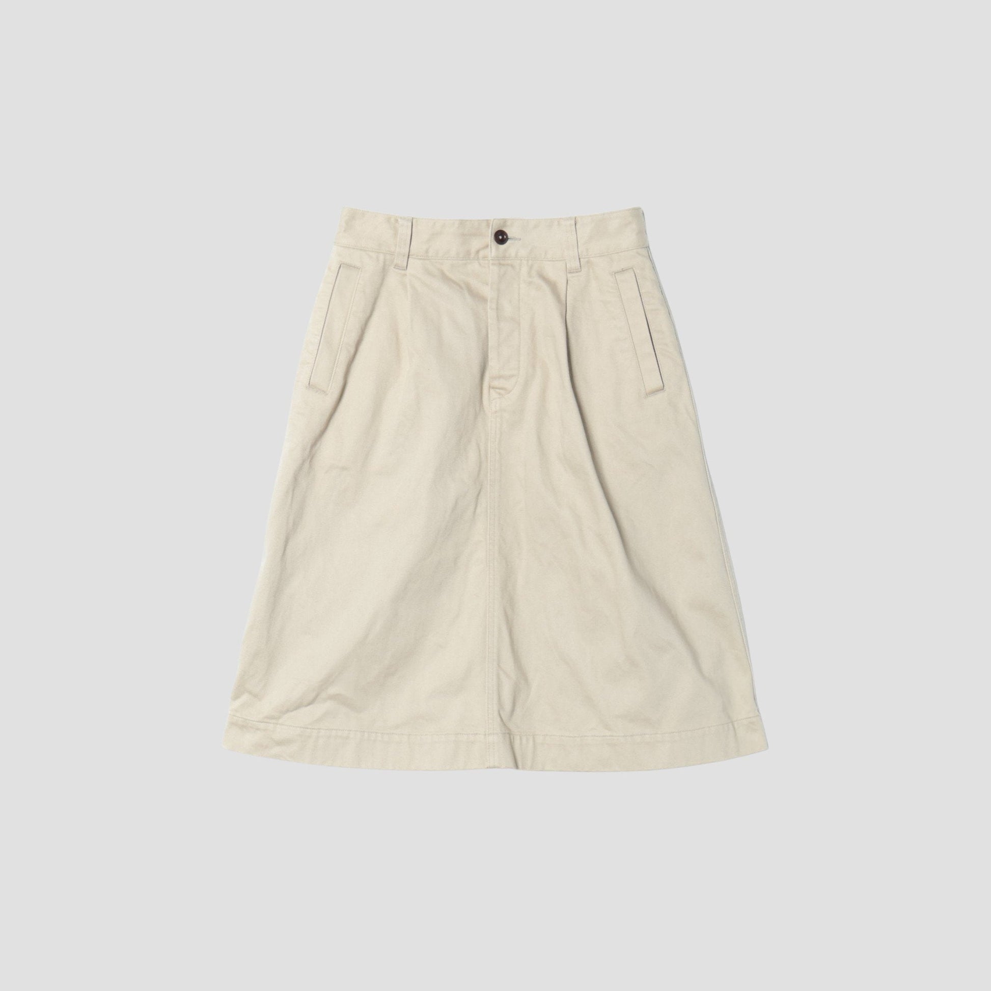 高密度に打ち込まれたタフな素材を用いており、使い込むほどに味わいが増すスカート。